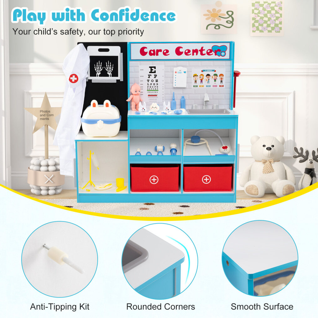 ● Tidy Up, Play On: The pretend hospital playset comes with a medical carrying case to hold 29 included medical accessories. With a handy doctor's coat hook, accessible open compartment, 2 open shelves, and 2 fabric drawers, every tool has its place.