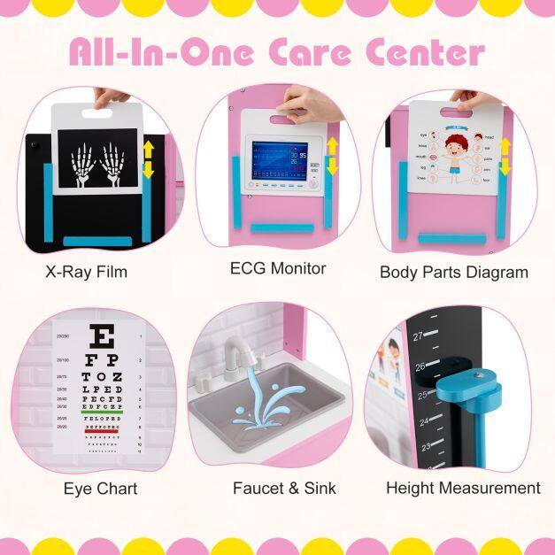 ● All-In-One Design: The X-ray film and ECG monitor allow children to mimic real-life medical procedures. The body parts diagram and eye chart provide educational value, helping kids understand basic medical concepts in a fun way. Also, the medical center toy set features faucet, sink, height measurer, and blackboard for more fun.