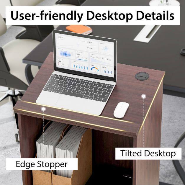 User-friendly Desktop Design: The podium stands in 117 cm height and features a tilted desktop that provides a cosy and convenient speaking angle for speakers. The barrier stopper is designed to prevent items from slipping down and the cable hole keeps messy wires in order.