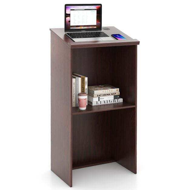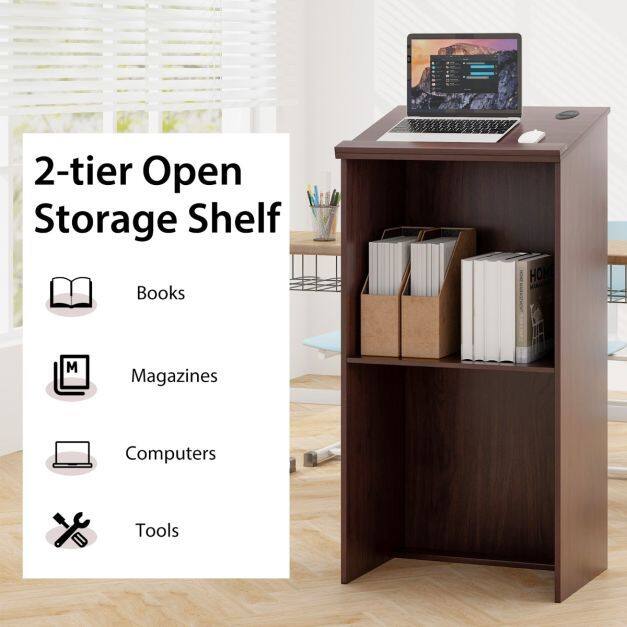 Featuring a slanted desktop, this lecture desk allows speakers to comfortably access their notes or documents while delivering their message with ease. The ergonomic design ensures a natural and relaxed posture to reduce strain. With a spacious storage shelf, this podium stand provides ample space for storing books and presentation aids. Moreover, the upgraded design of the speaking lectern is equipped with cable holes, which allows for easy and discreet cable management. This podium stand is a versatile and functional addition to any speaking environment, including a classroom, conference room, restaurant, church, and seminar. If you are looking for such a product, do not hesitate to buy it!
