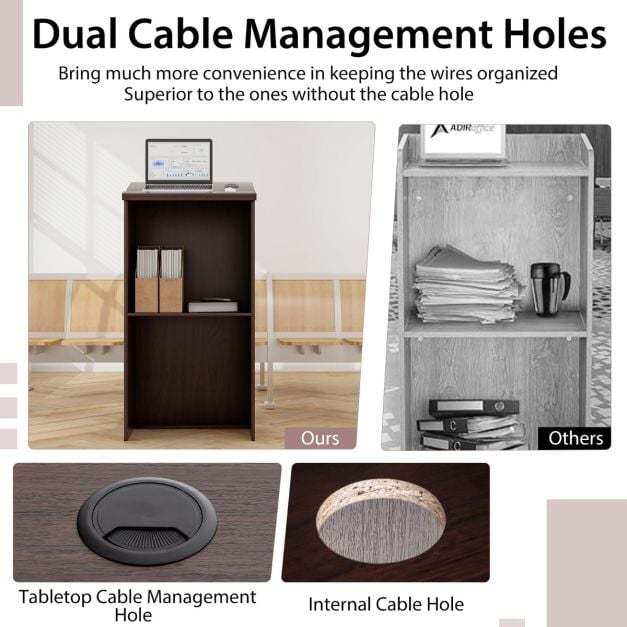 Convenient Storage Space: The open storage shelf provides ample space to keep your bottles, notes, books, or files organized and accessible. Moreover, thanks to the cable holes, this podium stand allows for easier integration of audiovisual equipment than other ordinary lectern desks without cable holes.