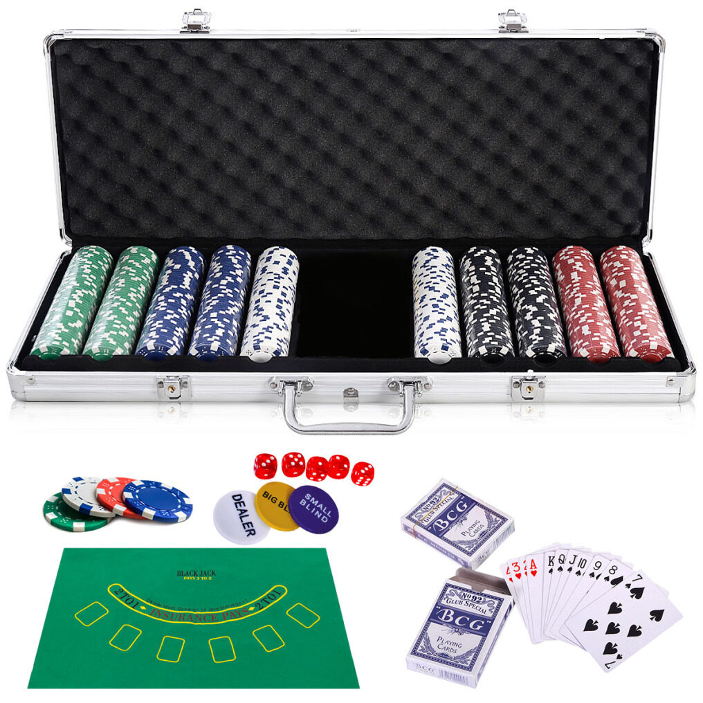 Complete set - aluminum case, 500 poker chips in 5 colors, 2 sets of poker cards, 5 dice and 3 dealer chips
