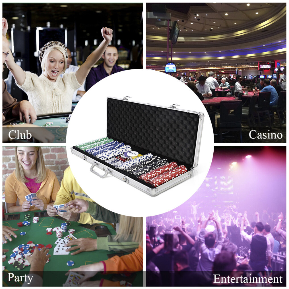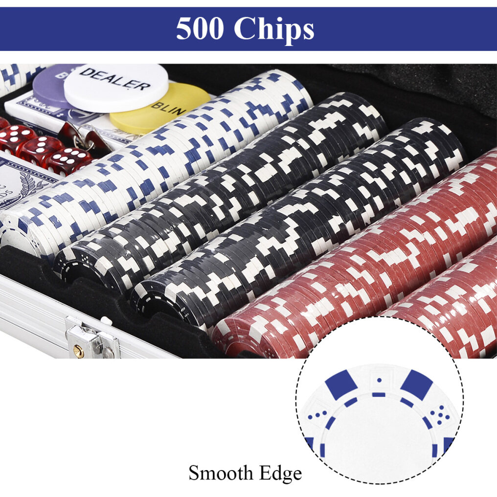 Aluminum case, 500 poker chips in 5 colors, 2 sets of poker cards, 5 dice and 3 dealer chips