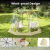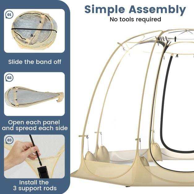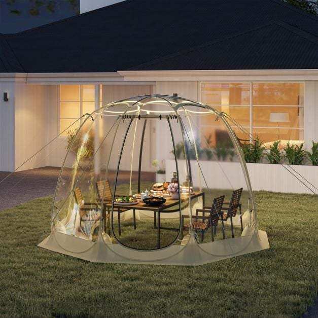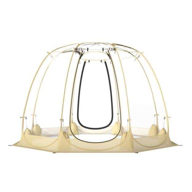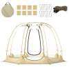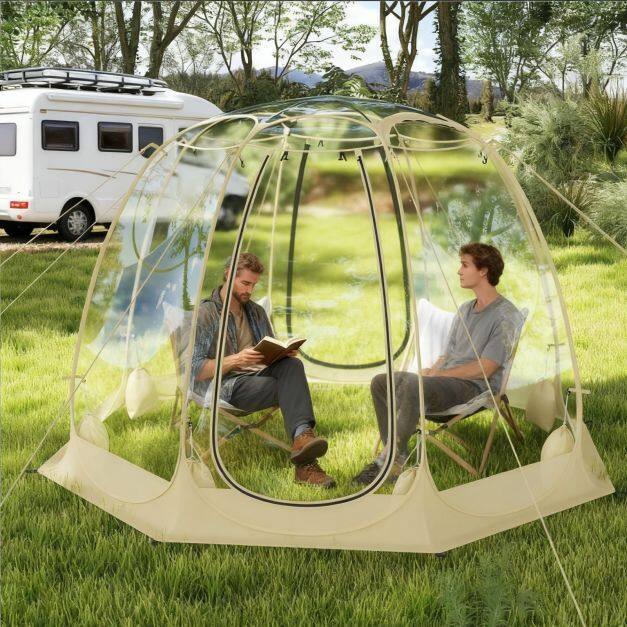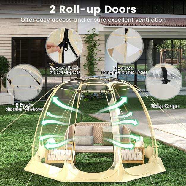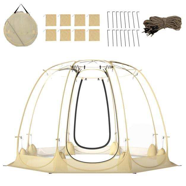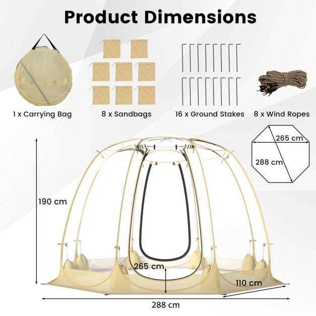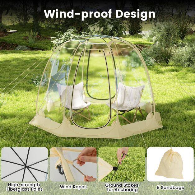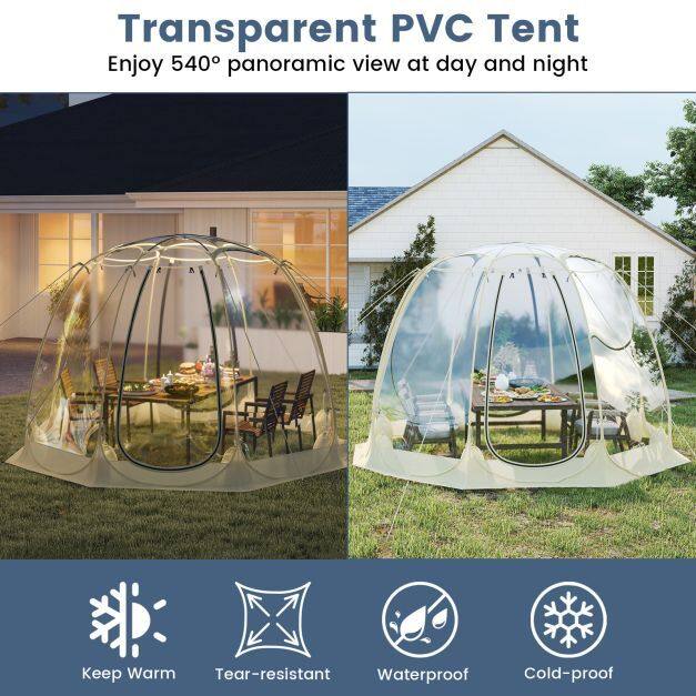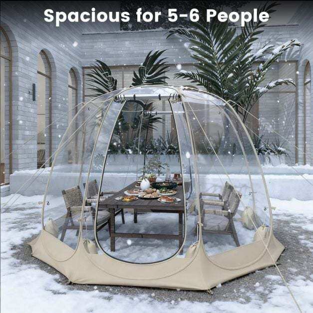 Our spacious 265 x 265 cm 8-sided bubble tent is designed for family gatherings or parties with friends and comfortably sleeps 5-6 people. This versatile shelter features quick pitching, robust construction, two generously sized zippered doors, and two side windows. The transparent PVC walls offer an impressive 630° panoramic view, making it an ideal winter shelter for enjoying the outdoor vista. Designed for a variety of weather conditions, this pop-up tent uses sturdy fiberglass poles and comes with 16 ground anchors, 8 guy ropes, and 8 sandbags for stability on any terrain.