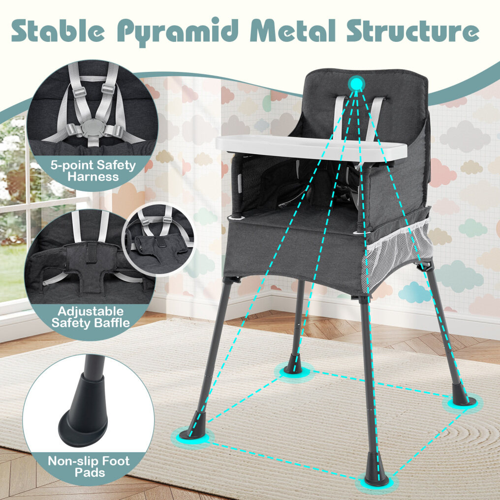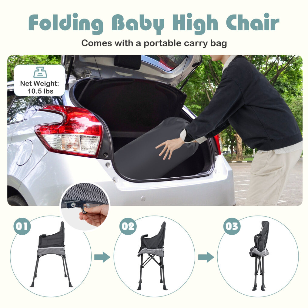 It can be folded into a narrow shape to save space. In addition, there is a portable bag for easy carrying. The food tray can be adjusted to 2 positions to grow with your child. The detachable tray is easy to clean. In addition, the oxford cloth cover is easy to detach with hook and loop fasteners. The 5-point safety harness keeps your child safe, while the anti-slip barrier provides extra protection. With metal legs and anti-slip mats, the seat will remain stable and sturdy in different places, such as the dining room, garden, beach and more.