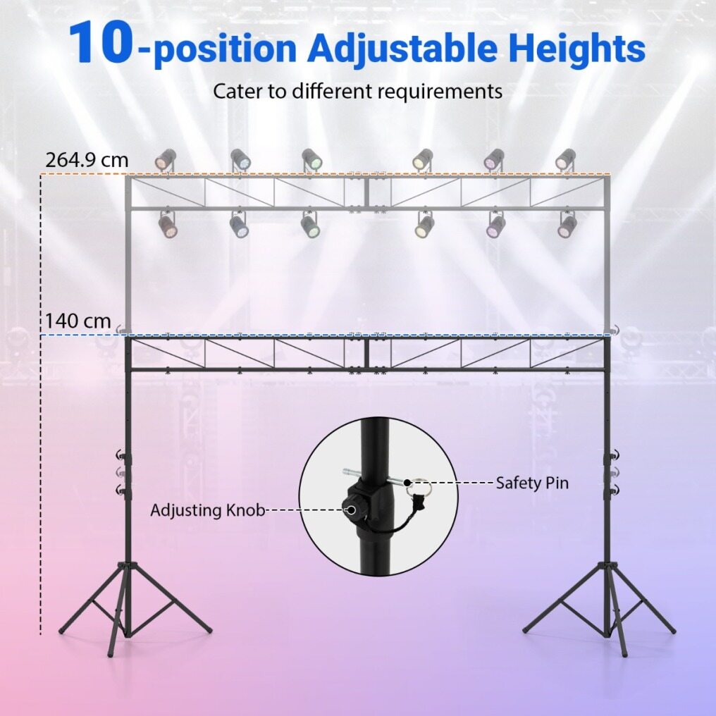 ● Adaptive Height Control: The lighting stand with truss features 10-position adjustable heights ranging from 4.6 ft to 8.7 ft, which will cater to different requirements with confidence. Thanks to safety pins and adjusting knobs, secure and precise height settings are available.
