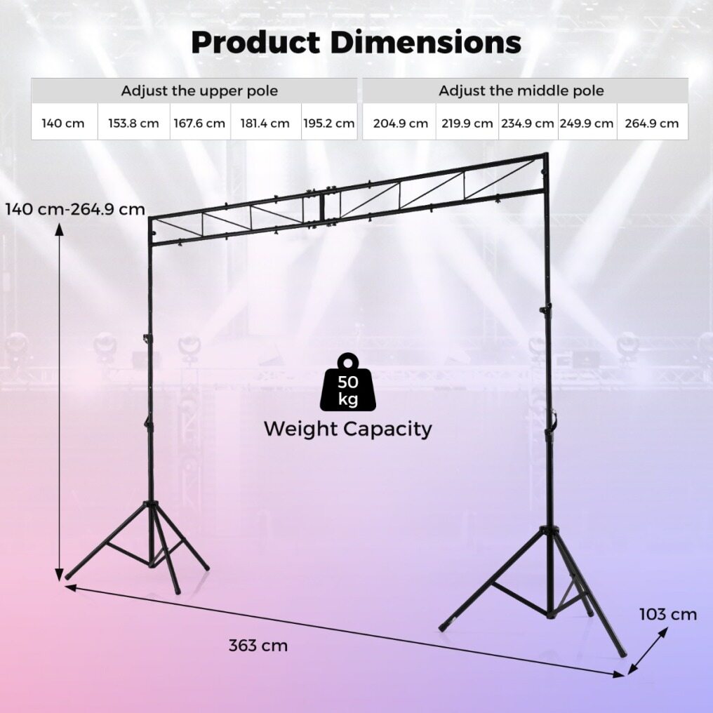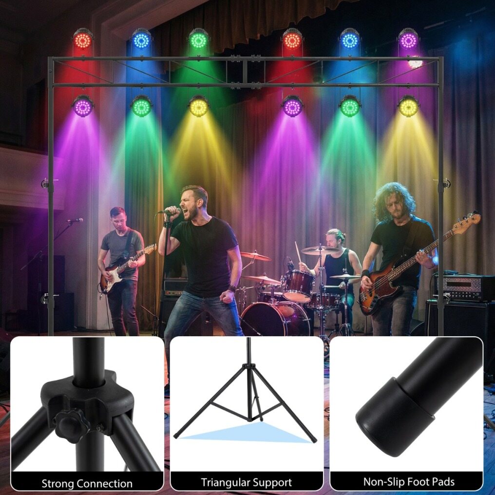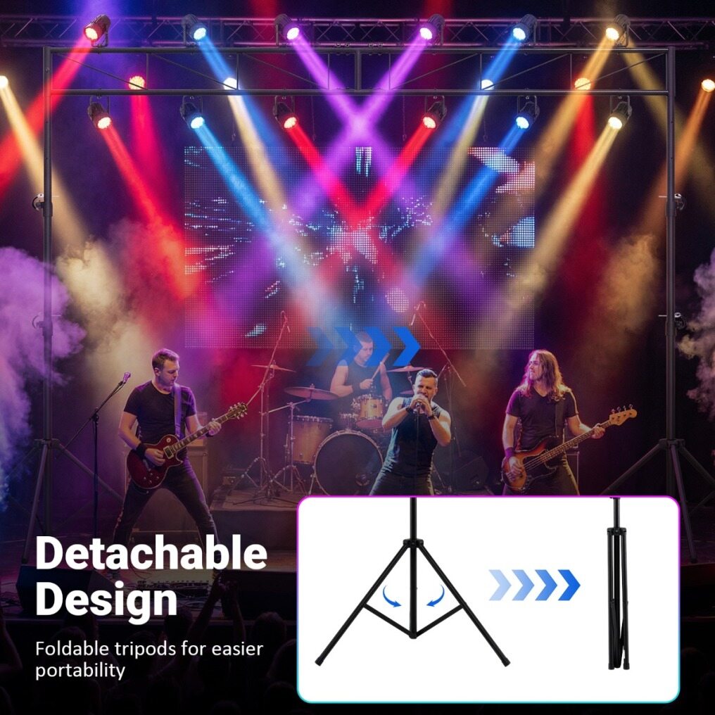● Foldable & Portable Tripods: Featuring a detachable design, the lighting truss system includes 2 folding tripods that enhance ease of transport and storage. This makes it perfect for mobile DJs and bands who require quick setup and efficient breakdown.