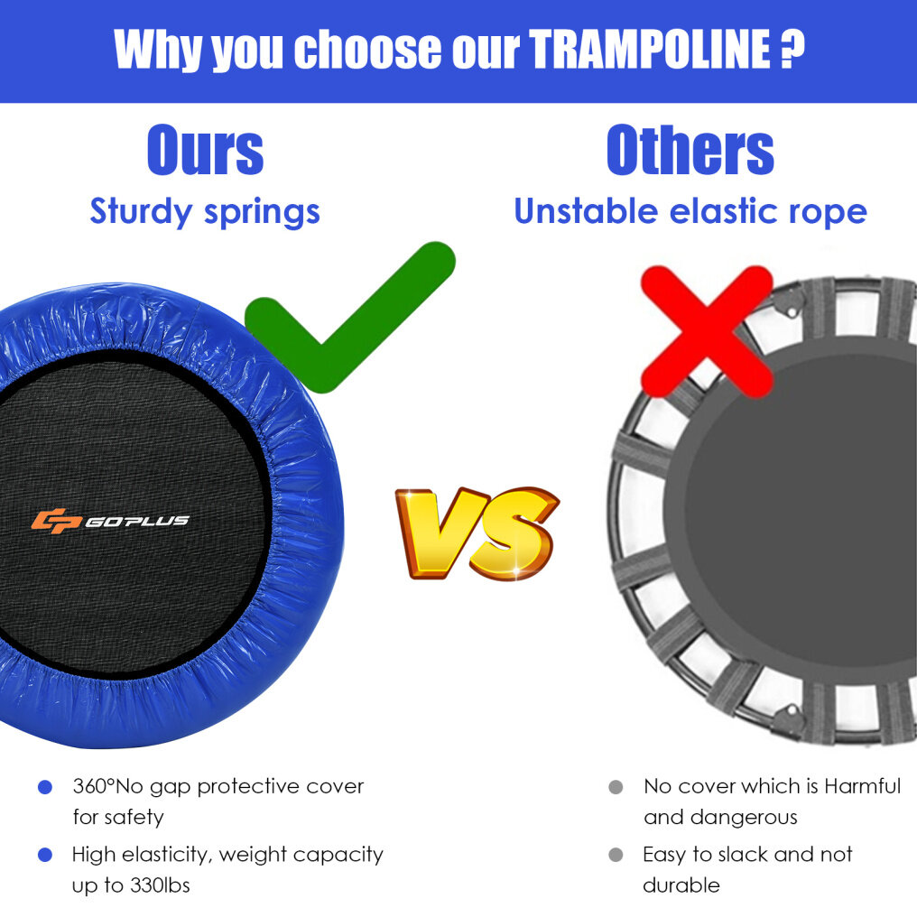 Perfect Workout Partner: This mini trampoline will provide you with brand new exercising experience. Different from the treadmill and the bike, you can enjoy purely and ultra-jumping feelings just by bouncing on the mat again and again. It is designed not only for adults who want to burn calories, but also for kids who are energetic and like doing exercises.