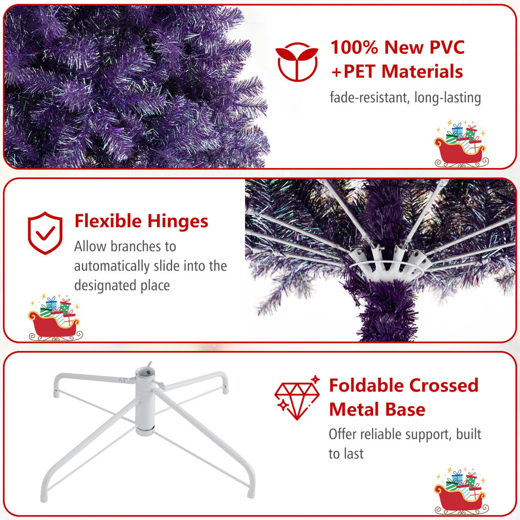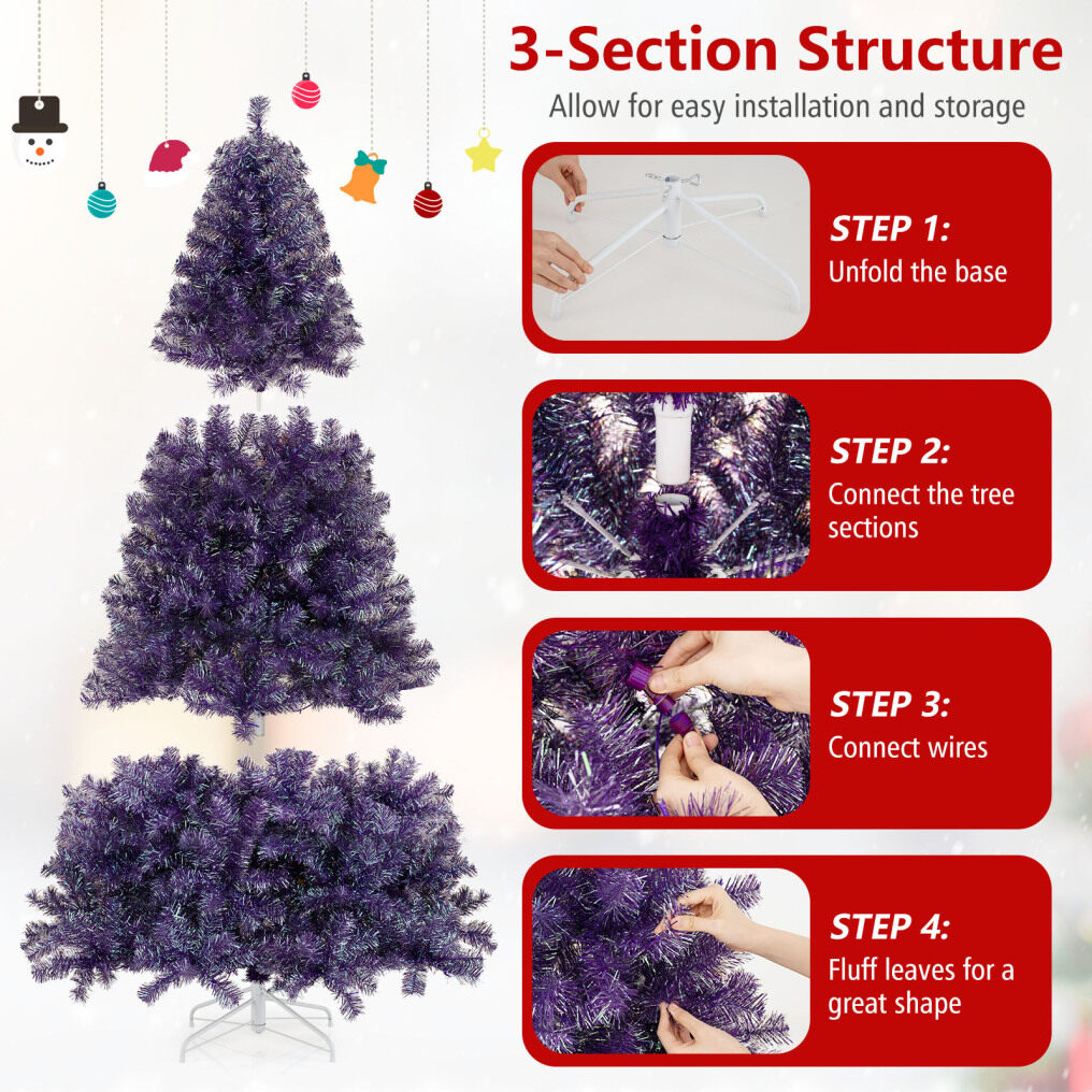 ● Mesmerizing Visual Display: This 6/7.5 ft tall artificial Christmas tree boasts an impressive array of 688/1300 branch tips, each adorned with multi-colored reflective films that enhances the tree's sparkle and shine. Plus, it is available in 4 stunning colors: deep purple, fruit green, pink, and lavender.