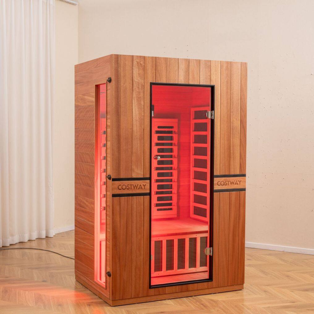 ● Mood-Enhancing Ambiance: The 2-person sauna room includes customizable RGB chromotherapy lighting, which offers static and dynamic modes, adjustable brightness and saturation, suiting your mood and preferences. Paired with 2 Bluetooth speakers, every session becomes an immersive audio-visual journey to suit your mood and enhance relaxation.