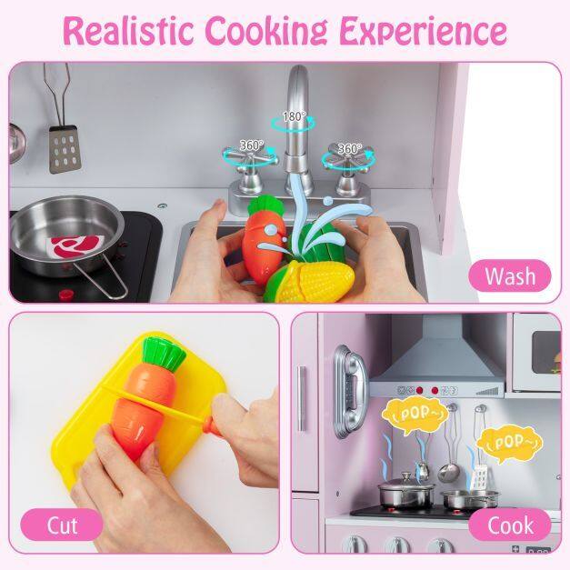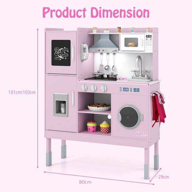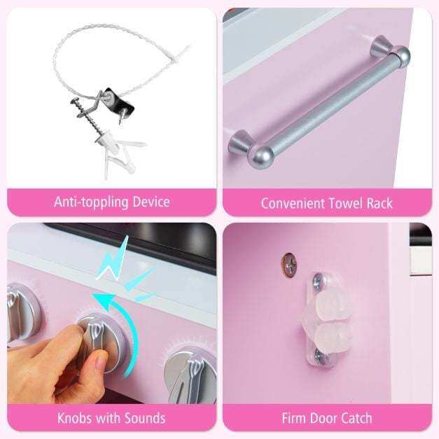 ● Reliable Design & Rich Storage: Crafted from high quality materials, the kids kitchen promises to accompany kids to grow up. And the anti-toppling device is equipped for stability and safety. What's more, the sufficient storage space holds a variety of items within reach.