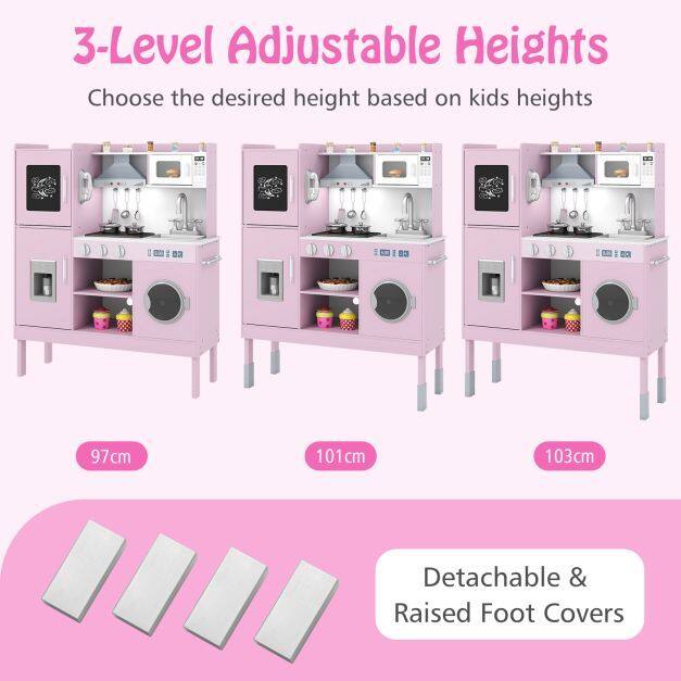 ● 3-Level Available Heights: This pretend play kitchen offers 3-level height options that allow you to choose the desired height based on different needs. With the detachable and raised foot covers, you can adjust heights easily.
