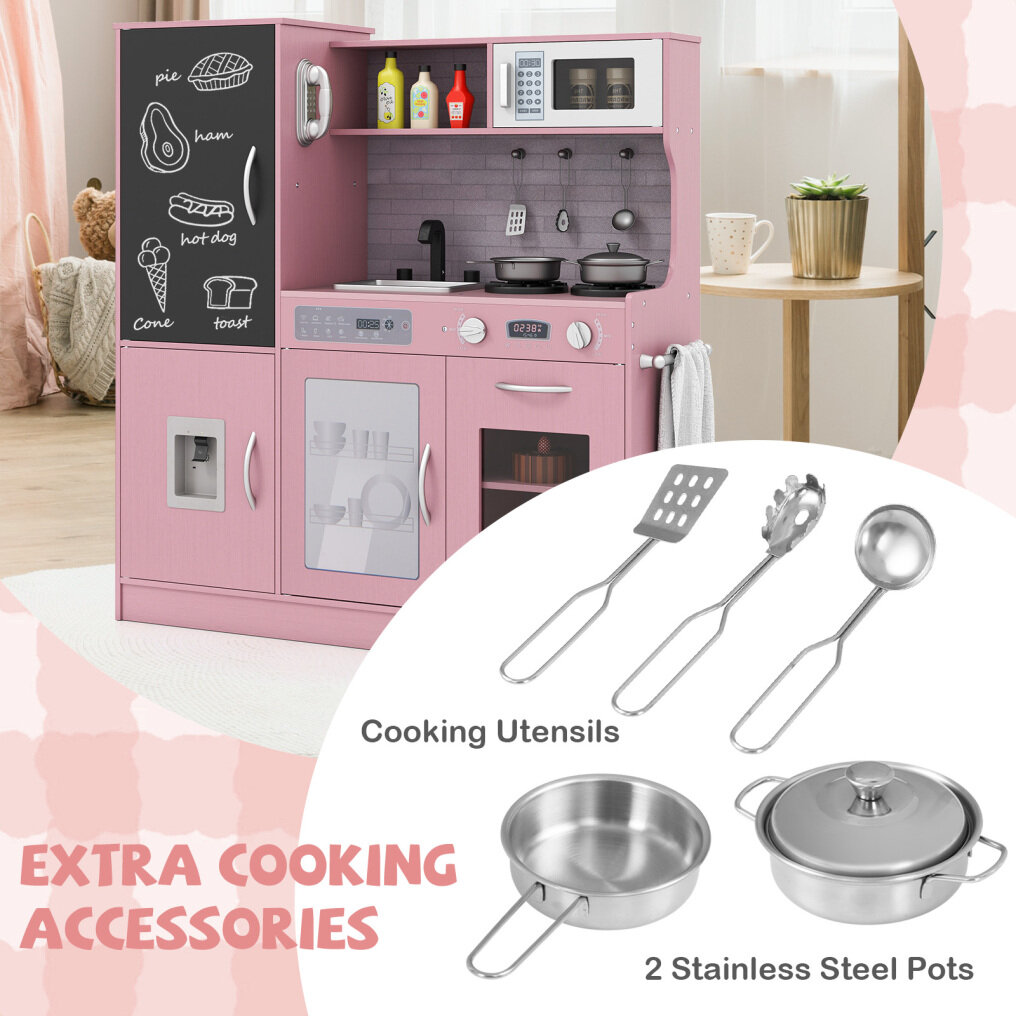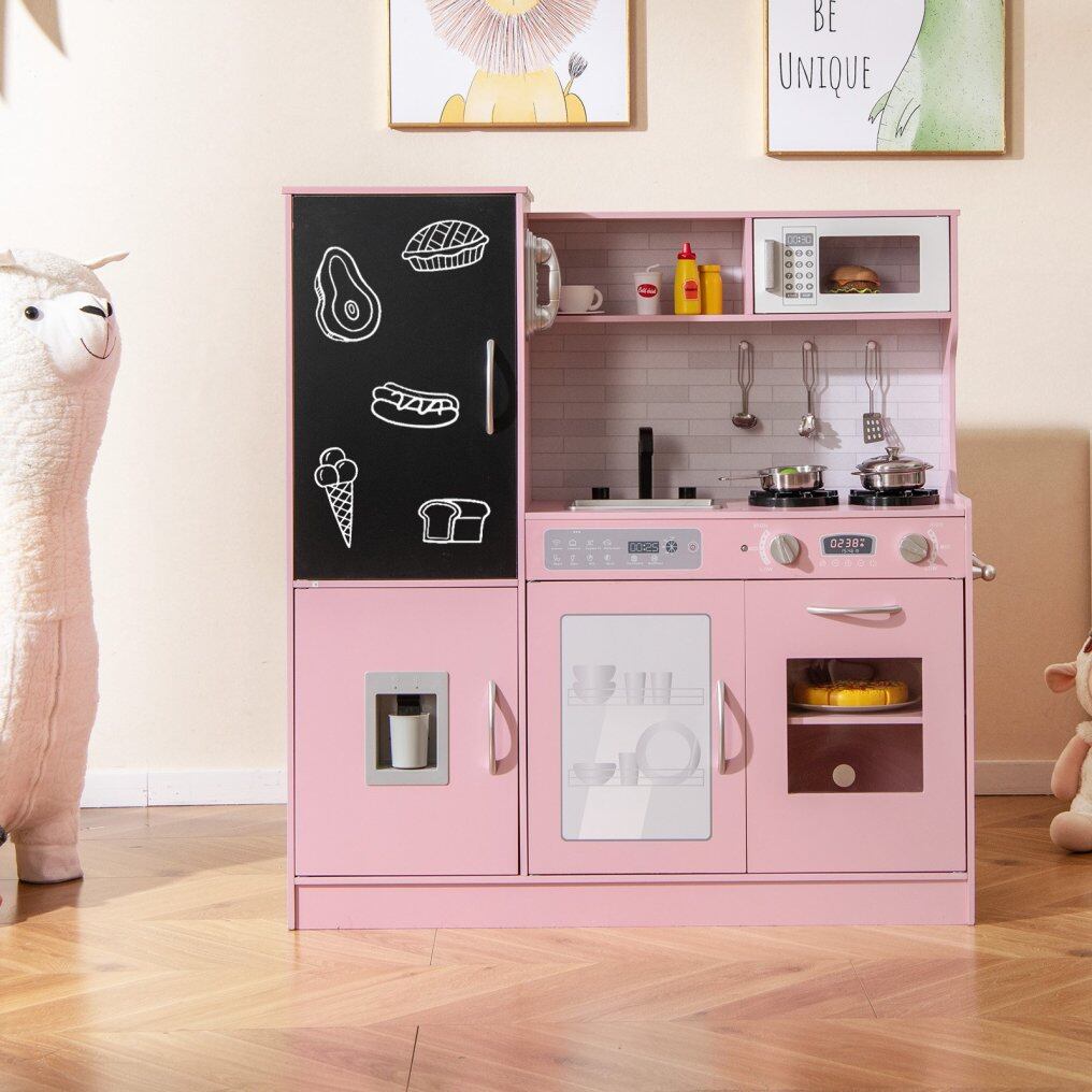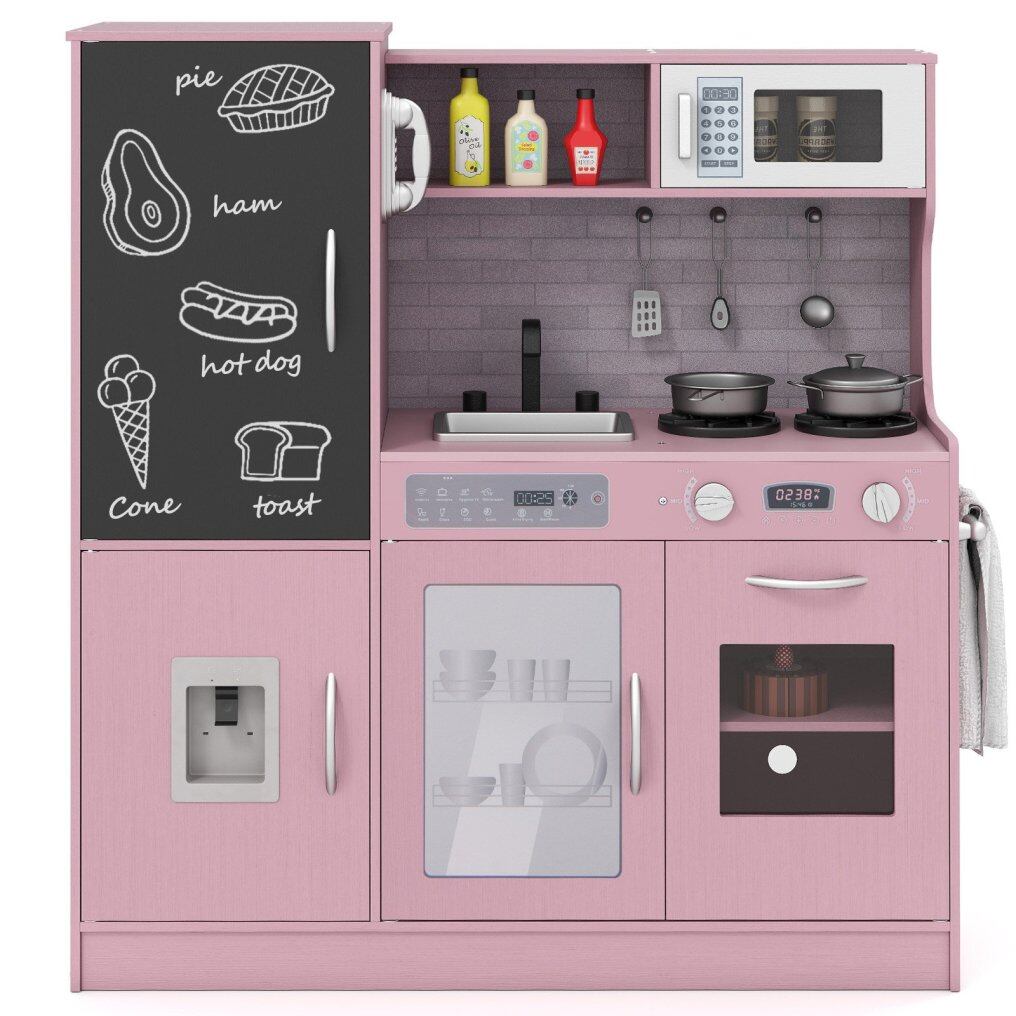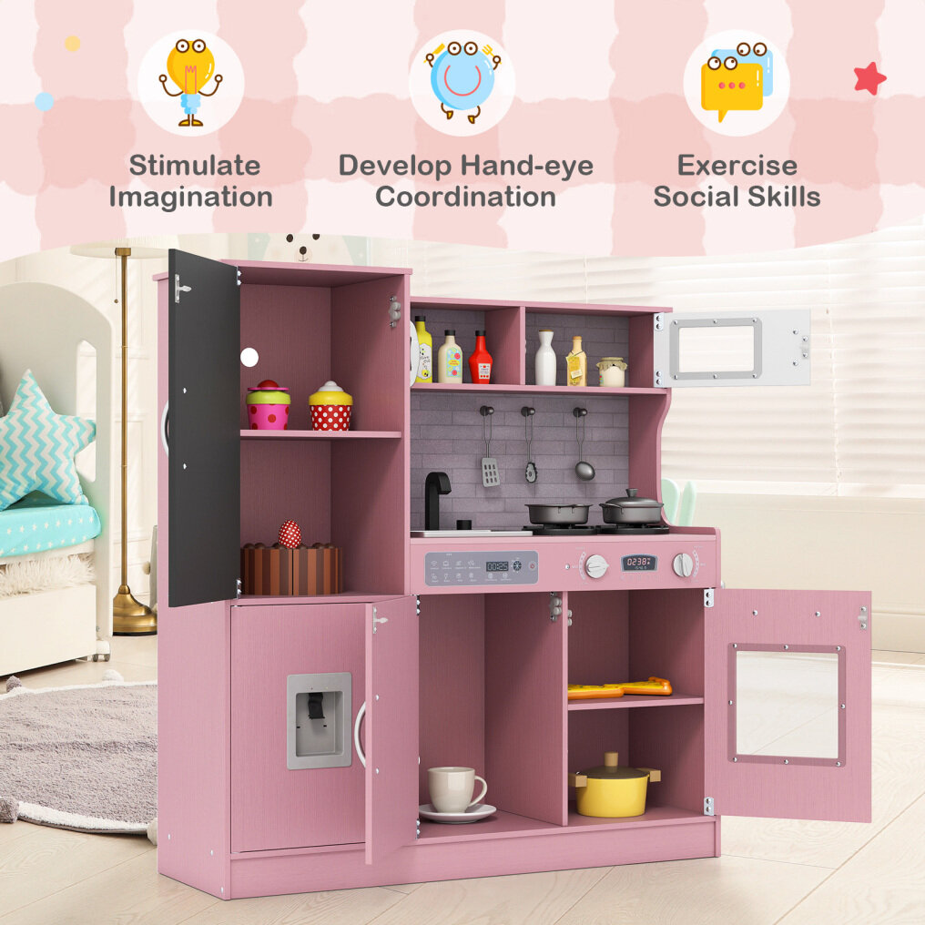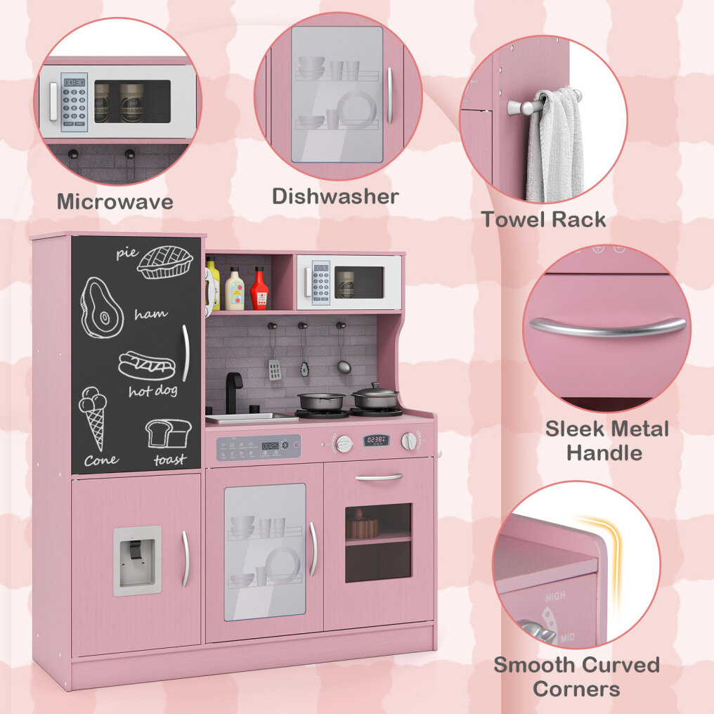 ● Realistic Kitchen Simulation: This play kitchen boasts a complete setup including a dish washable machine, oven, microwave oven, sink with a rotatable faucet, telephone, stove, and water dispenser. Your little chef will feel like a pro with all these interactive features.