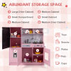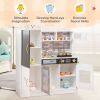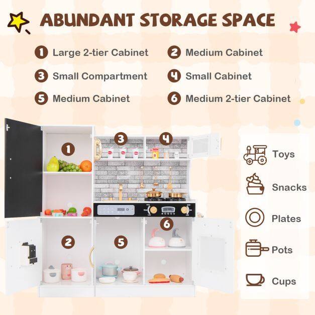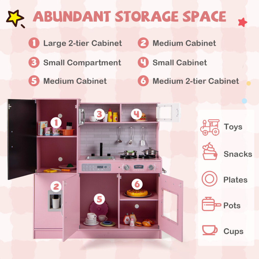 ● Ample Storage Space: The pretend play kitchen comes with 5 enclosed cabinets, 1 open compartment, 3 hanging hooks, and a towel rack, which could serve as an extra cabinet for books, toys, and groceries. Also, it adds to the realism of the kitchen but also teaches children the importance of organization and cleanliness.