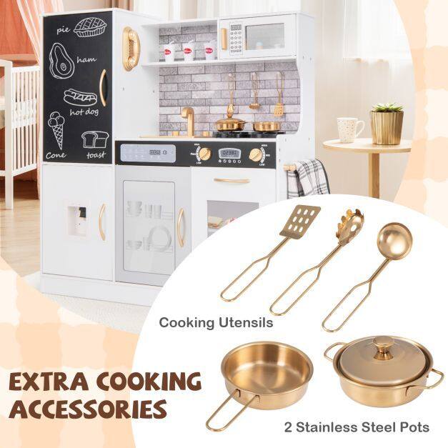 ● Chalkboard Surface: Encouraging creativity and organization, the wooden toy set includes a chalkboard with chalk for jotting down pretend ingredients and recipes. It enhances imaginative play and allows children to express themselves artistically.