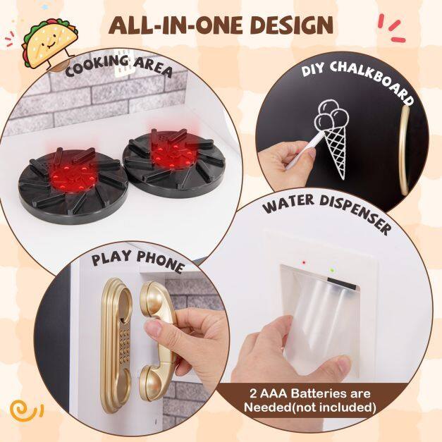 ● Realistic Light & Sound Effects: The stove top could light up and make real cooking sounds, while 2 rotatable knobs make a satisfying clicking sound when turned. Moreover, the water dispenser comes to life with light and sound effects. Each component requires 2 AAA batteries (not included).