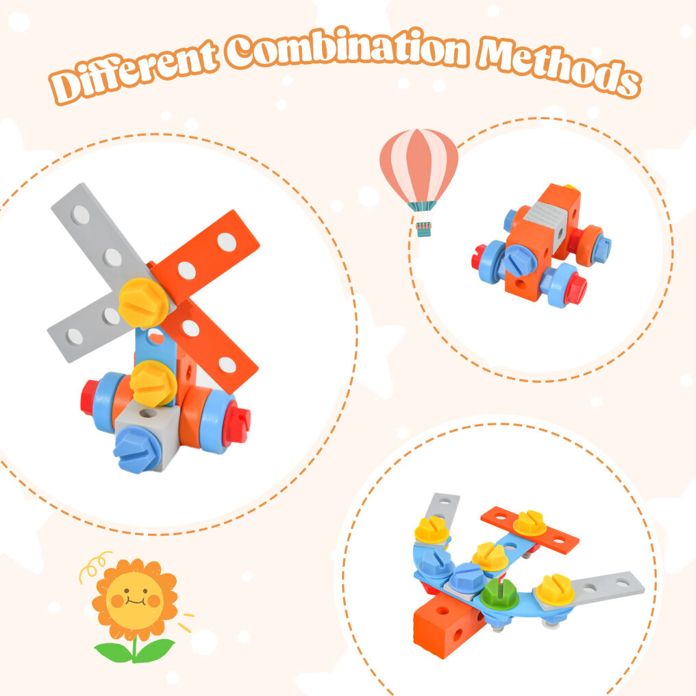 ● Wooden Tools and Accessories: Coming with 6 pieces of cute wooden tools and 75 pieces of accessories, this kids tool bench is nice to exercise kids' fine motor skills and spark their imagination. Toddlers can use these accessories to create a windmill, airplane, car or other amazing things.
