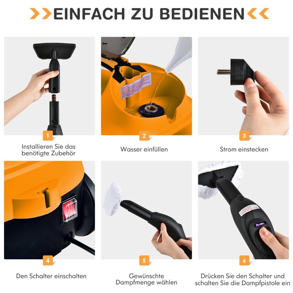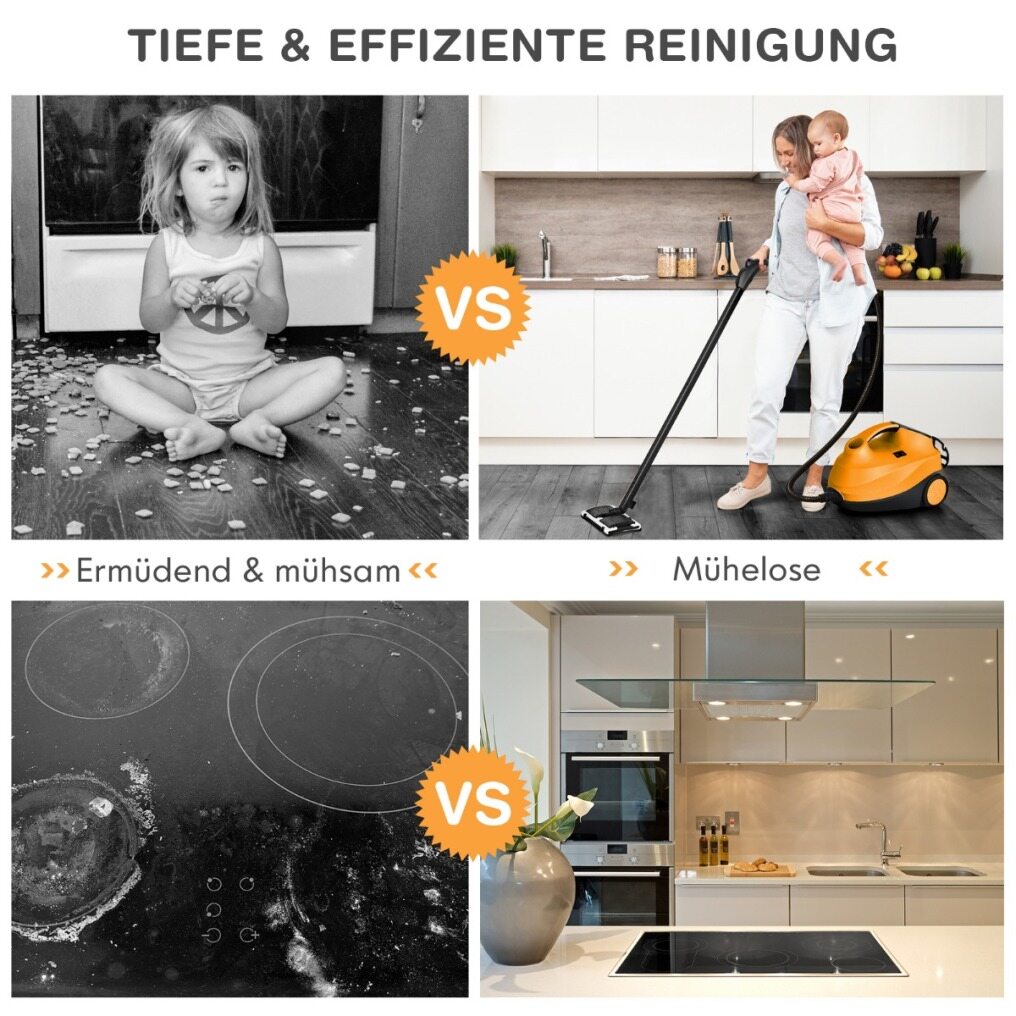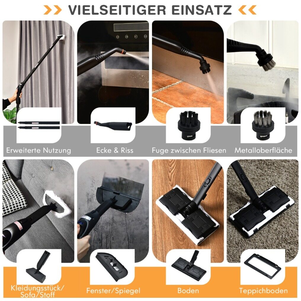 This is our reliable steam cleaner with high efficiency and deep cleaning power. The high temperatures and steam pressure are extremely helpful for cleaning floors, windows, and appliances. Everything is cleaned and disinfected without the use of chemicals. The 1.5-liter water tank can heat up to 108°C in 5-6 minutes. The operating time is approximately 45 minutes. The child lock and automatic shut-off ensure that your children and pets are safe. With the versatile accessories, you can remove dust mites at home, in the office, and in the car. This makes it the most powerful and reliable steam cleaner we have ever offered. Order today and enjoy the benefits of steam cleaning.