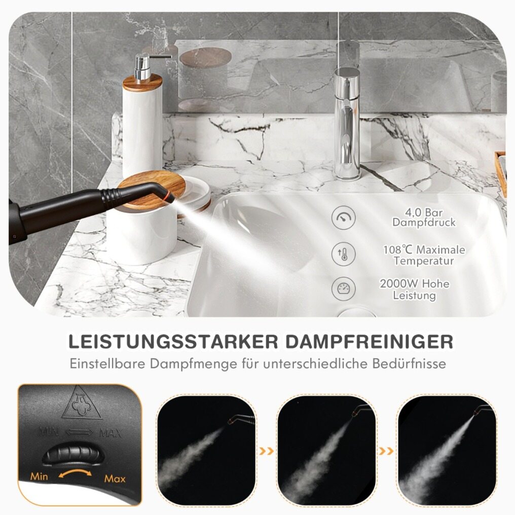 Efficient and Chemical-Free Cleaning - The 2000W steam cleaner offers a high steam temperature of up to 108°C for thorough cleaning and disinfection without harsh chemicals. In addition, the steam pressure can reach up to 4 bar, allowing you to easily remove all types of dust on various surfaces and quickly clean your room.