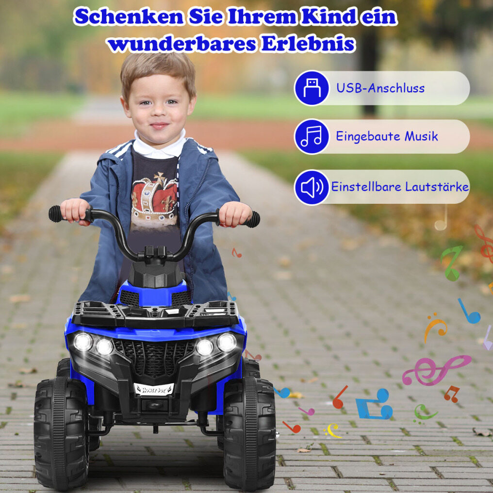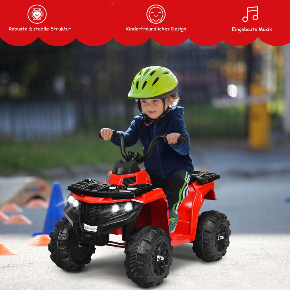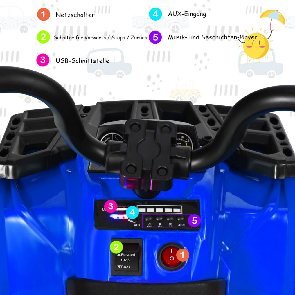 Attractive features: External devices can be connected via various interfaces, so children can listen to music or cartoons while driving. Thanks to the capacious battery, the quad can be used for up to 60 minutes.