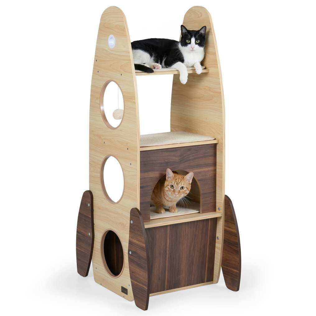 Ignite your cat's adventure with our cat tower. The unique rocket design makes this wooden scratching post especially appealing to your feline friend. A cozy lower cave provides a safe retreat for peace and privacy, while the semi-enclosed platform serves as a comfortable nap spot and an ideal vantage point. At the very top, a special perch with a safety railing allows your cat to safely survey its territory. The sisal-covered scratching mat keeps claws healthy, while a hanging ball encourages active play and hunting. The sturdy triangular construction guarantees stability. Three generously sized openings with rounded, smooth edges ensure safe, bump-free access. Removable scratching mats and easy-to-clean surfaces simplify maintenance and make this cat tree the perfect indoor playground for your cats.
