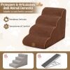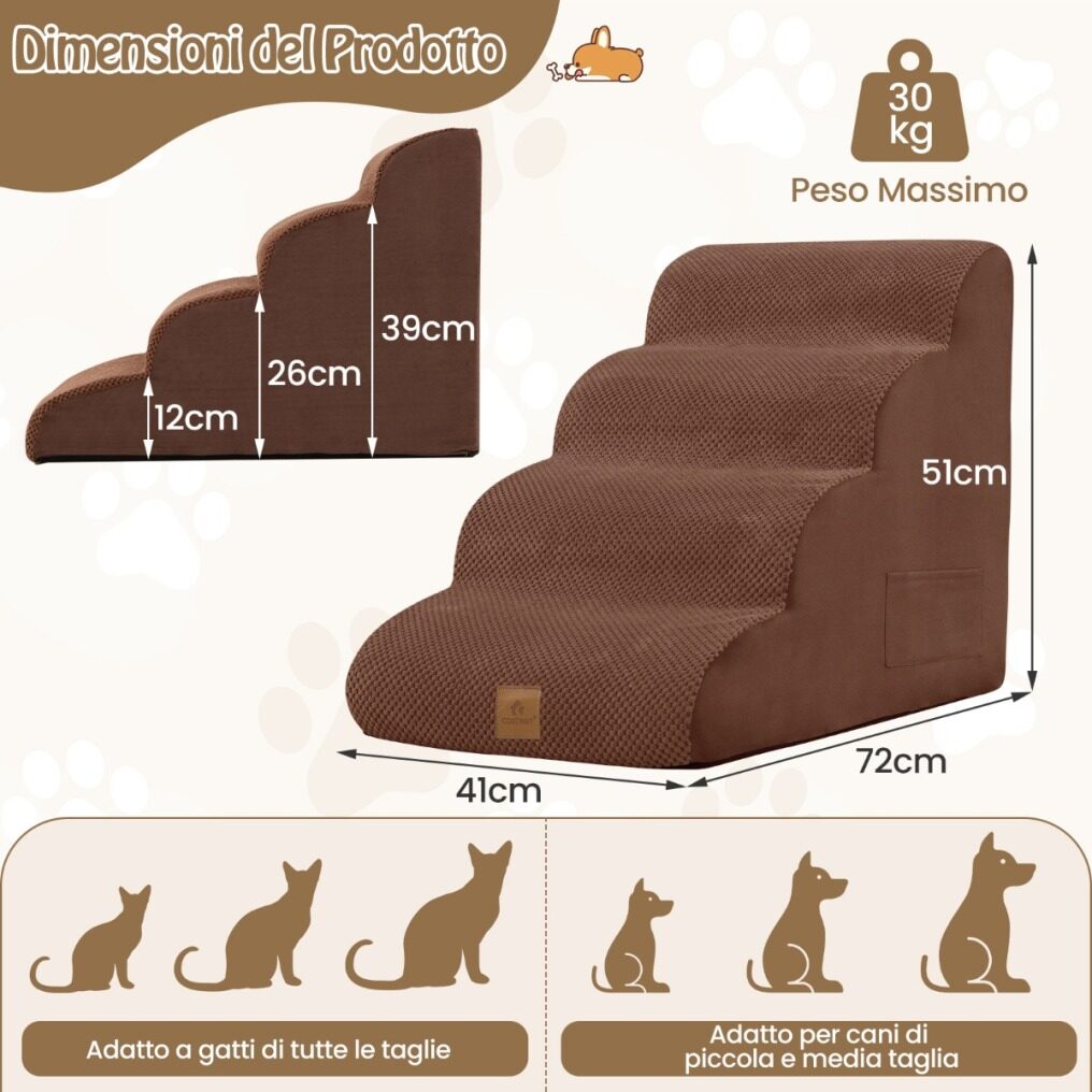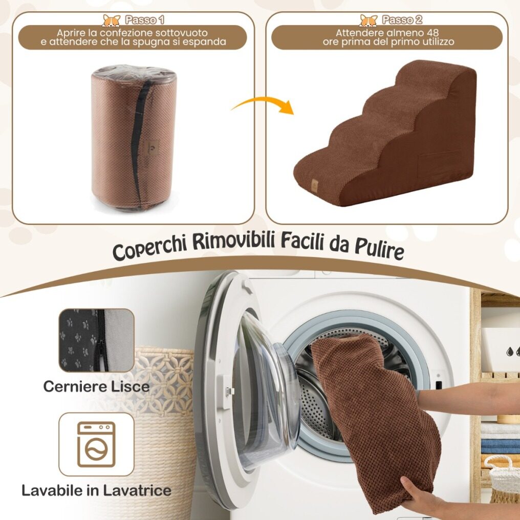 Our 4-tier foam dog ramp measures 72 x 41 x 51 cm (L x W x H) and features 4 steps, helping your lovely pets get up and down from high places. Compared to regular dog stairs, our dog ramp is supported by high-density foam, which offers an ultra-soft touch and recovers quickly for better support. The gentle slope design is gentle on pets' joints and effectively reduces the strain on their paws from constant jumping up and down. The surface is made of premium suede fabric, and the bottom is designed with silicone paw prints to improve friction, preventing dogs from slipping when moving on it. The ramp cover is zippered so it can be removed for cleaning and is machine washable. Please note: For ease of transportation, the dog ramp uses vacuum compression packaging and may take some time (48 hours or more, depending on ambient temperature) to fully fold up.