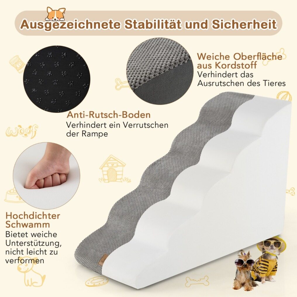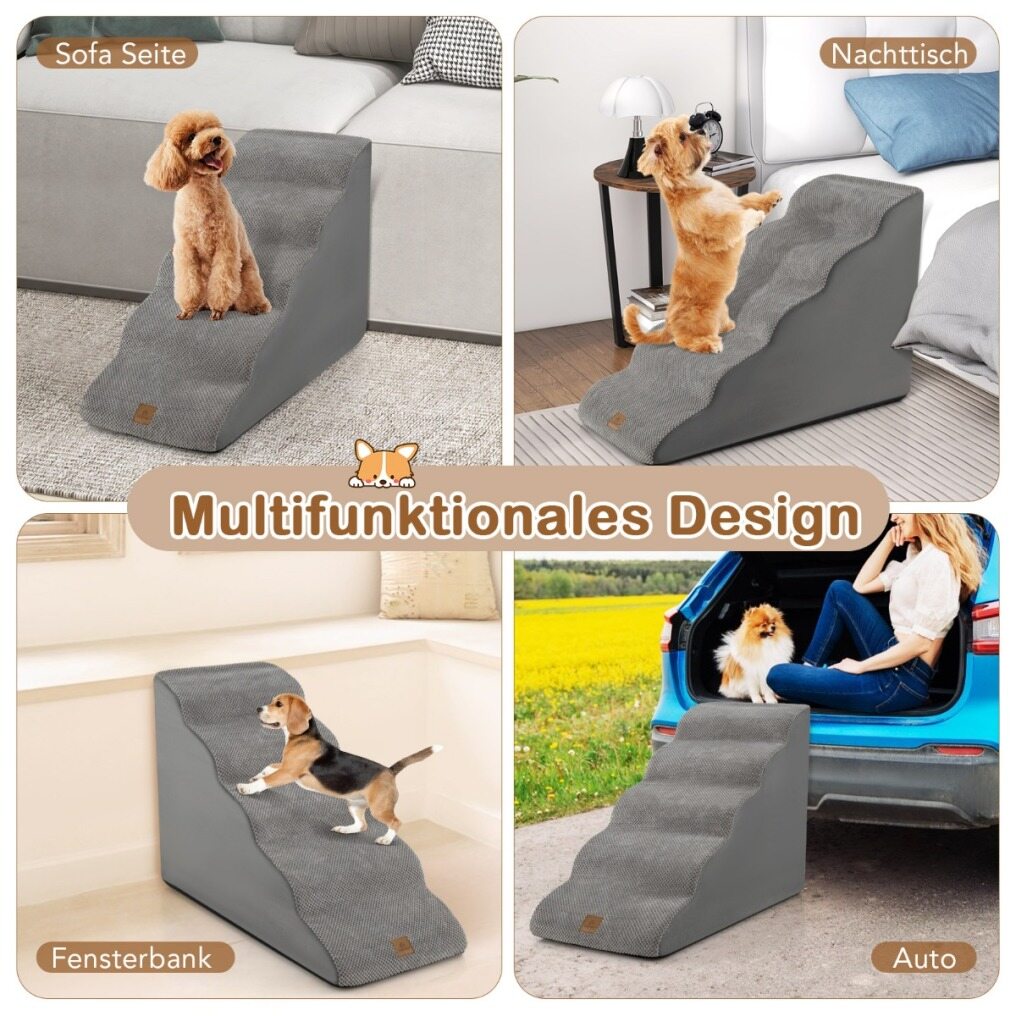 Multifunctional Design: The 5-step pet ladder measures 41 x 87 x 56 cm (L x W x H), and is suitable for small dogs, cats, short-legged pets or senior dogs. With the ramp, your pets can easily access beds, sofas, or cars without assistance, improving their overall well-being.
