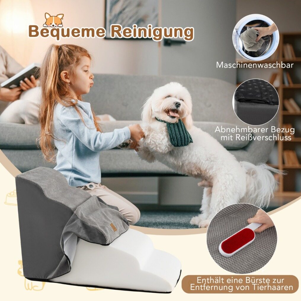 Convenient Cleaning: The pet stairs come with a removable and machine washable cover, ensuring hassle-free cleaning. It also includes a pet hair removal brush to help you keep the stairs free from hair and dirt.
