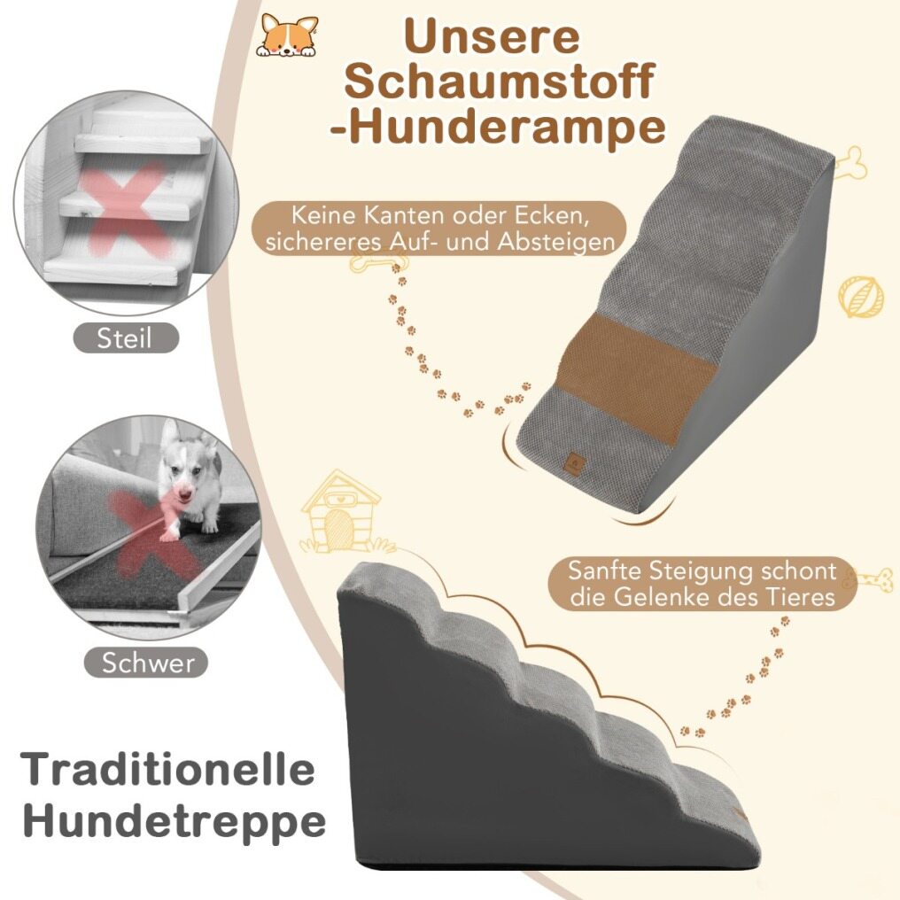 Safer & Wider Steps: Unlike traditional heavy and steep dog stairs, this foam dog stairs features a gentle slope and wide steps, which can effectively reduce the strain on your pet's joints when going up and down. Plus, it has no edges or corners for added safety.