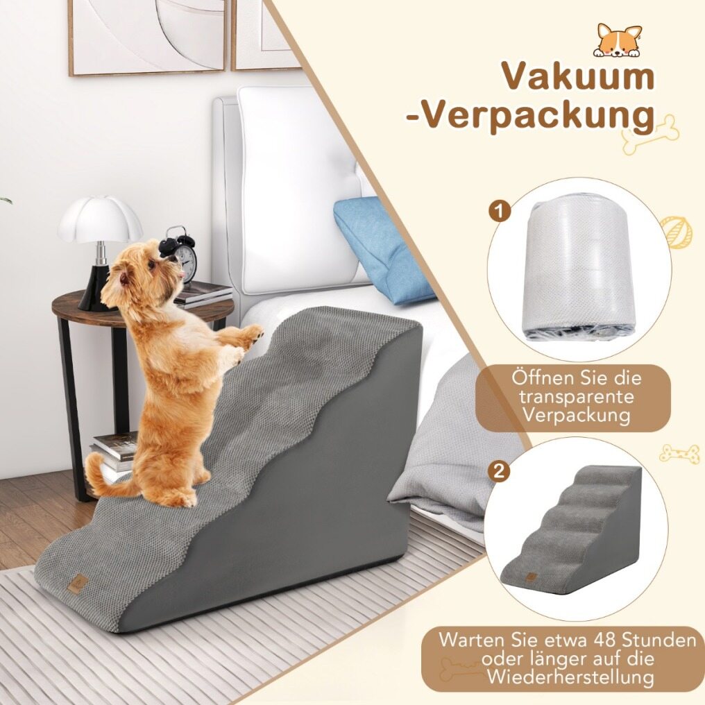 Vacuum Compressed Packaging: The dog stairs are conveniently vacuum-packed for easy storage and transportation. Simply unpack the clear package and wait about 48 hours or more for recovery, with faster rebound depending on the ambient temperature.