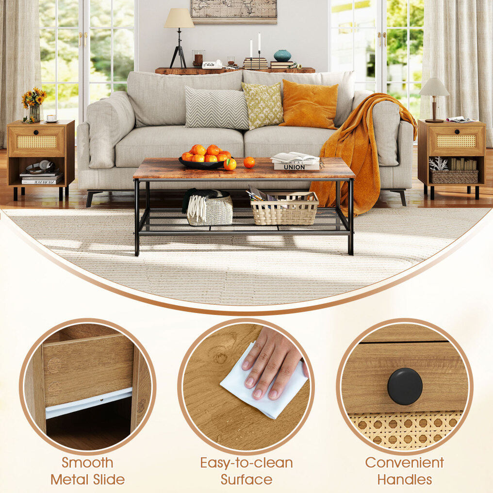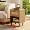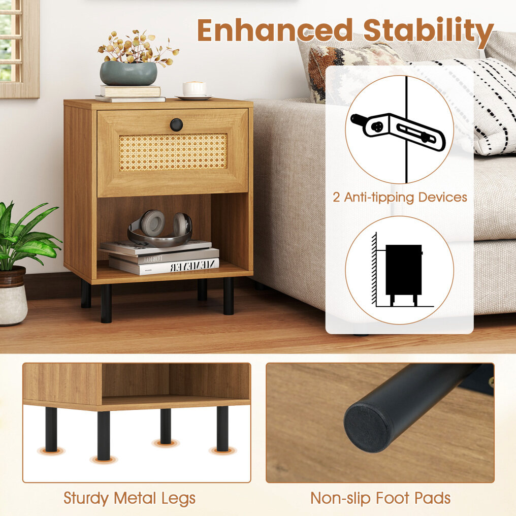 ● Boho-inspired Nightstand: This exquisite piece combines the warmth of oak wood grain, and the beauty of natural rattan weaving, enhancing the aesthetic appeal of your space. The boho-inspired design blends well with any style of decor.