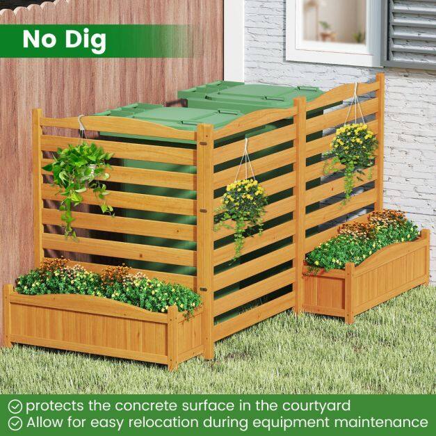 The fence with planter boxes combines practical functionality with aesthetic appeal in one seamless solution. It features a no-dig installation that eliminates the need to drill into concrete or lawn, allowing easy relocation during maintenance while ensuring stability with the built-in planter box and optimal airflow through the slatted fence panels. Crafted from treated natural fir wood, this decorative enclosure offer a smooth, splinter-free surface with long-lasting durability and attractive outdoor aesthetics. The fence supports vertical gardening with drainage-equipped planter boxes and removable bottom panels for planting long-root species. Its flexible 2-panel/3-panel design can be arranged in multiple configurations or expanded with additional panels to conceal large items.