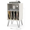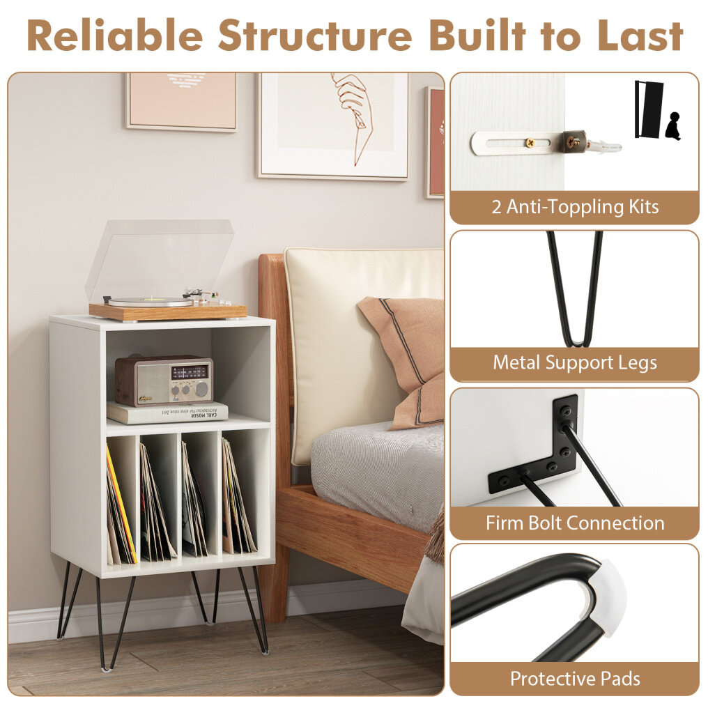 ● Reliable Structure Built to Last: The premium wooden top boasts durability and strength. Equipped with 2 anti-toppling kits, this vinyl record storage table enhances safety and prevents accidental tipping. The metal legs with non-slip foot pads promise a stable foundation.