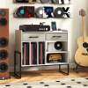 Power & Connectivity Hub: This large record player stand features a built-in charging station with 2 AC outlets, USB port, and Type-C port, keeping your turntable, phone, and devices powered. The built-in cable hole ensures safe, tangle-free charging of multiple electronics while you enjoy your vinyl collection.