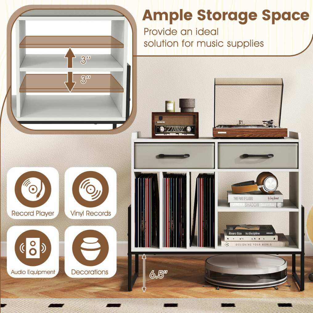 Maximized Storage Solutions: This vinyl storage cabinet offers a spacious tabletop, divided record compartment, 2 fabric folding drawers, and a 3-position adjustable shelf to organize albums and accessories. The thoughtful layout accommodates various record sizes while keeping your collection easily accessible and protected from dust and damage.