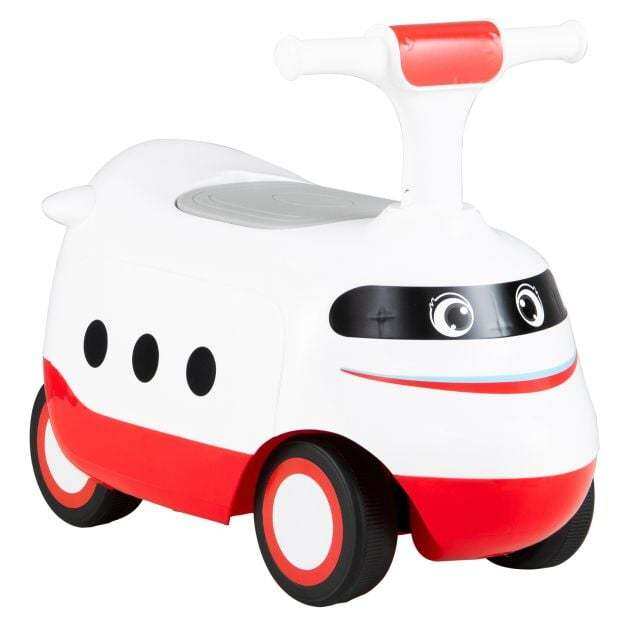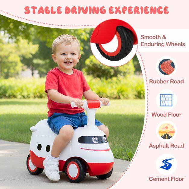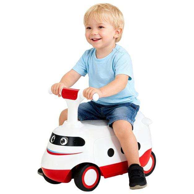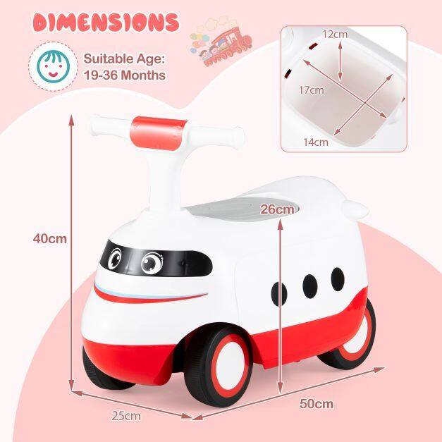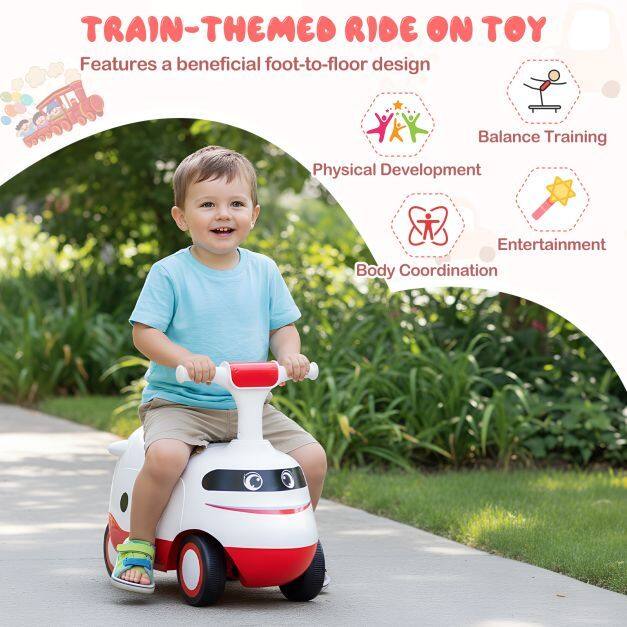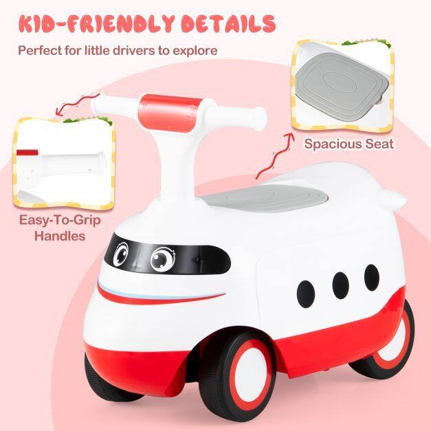 Equipped with under-seat storage, it keeps toys and snacks within reach for exciting journeys. The enduring wheels ensure smooth rides on any surface, from rubber roads to wood floors. Safety is a priority with easy-to-grip handles and a comfortable seat, making each ride cozy and secure. This train-themed ride on toy not only promotes physical development and balance training but also encourages hours of imaginative play. It is perfect for little drivers to explore.