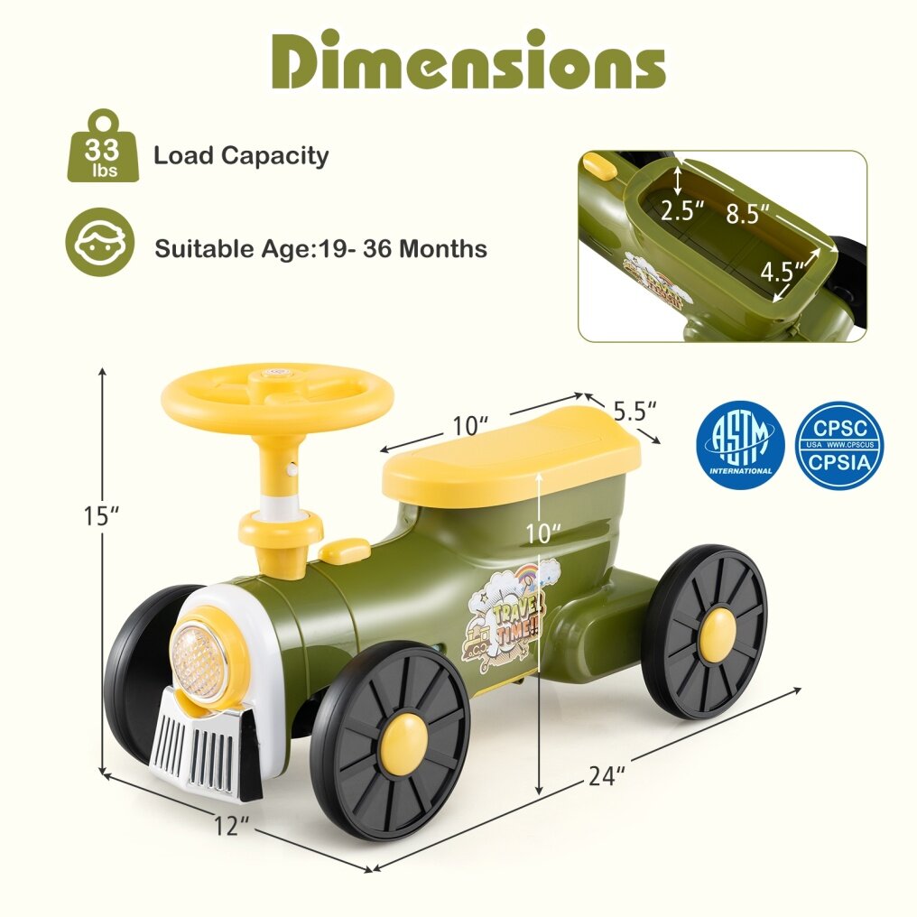 This fantastic kids ride on toy is packed with fun features like a train whistle sound button, realistic headlight, and vibrant stickers to spark children's imagination during active play. With a secure 35° steering angle and 4 large wheels, it offers a stable and smooth ride on any surface. The convenient under-seat storage compartment can organize and access your child's favorite items. The lightweight design makes it easy to transport. This UKCA compliant ride on toy caters to children aged 19-36 months, helping enhance balance, muscle strength, and motor skills. A delightful and practical gift option for supporting a child's growth and development. If you are looking for such a product, do not hesitate to buy it!