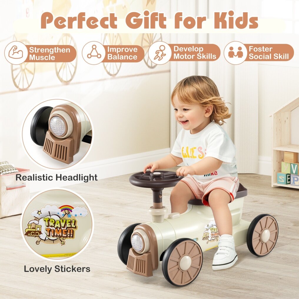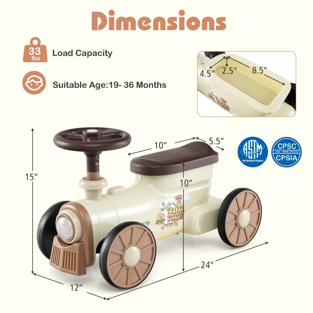 This fantastic kids ride on toy is packed with fun features like a train whistle sound button, realistic headlight, and vibrant stickers to spark children's imagination during active play. With a secure 35° steering angle and 4 large wheels, it offers a stable and smooth ride on any surface. The convenient under-seat storage compartment can organize and access your child's favorite items. The lightweight design makes it easy to transport. This UKCA compliant ride on toy caters to children aged 19-36 months, helping enhance balance, muscle strength, and motor skills. A delightful and practical gift option for supporting a child's growth and development. If you are looking for such a product, do not hesitate to buy it!