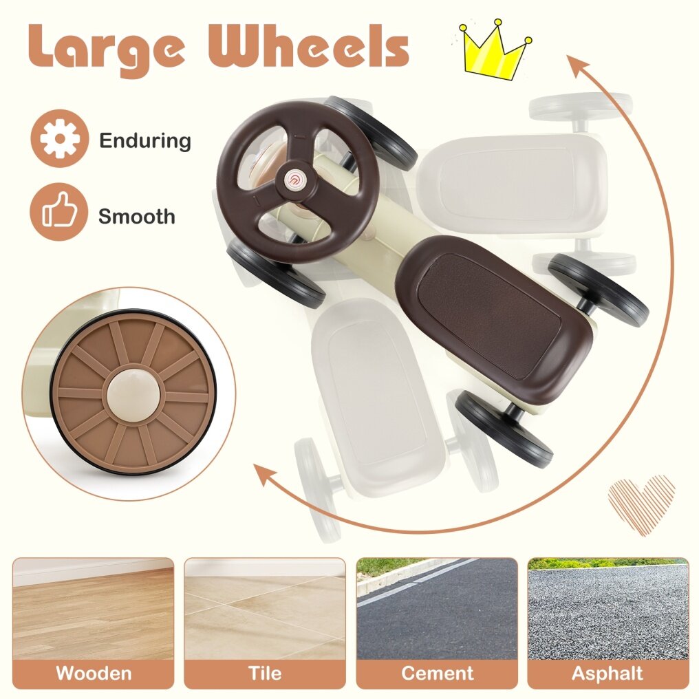 Enhanced Safety Design: The ride on toy is built with a secure 35° steering angle and 4 large wheels, providing a stable and smooth ride on various surfaces including wood, cement, tile, and asphalt, making it an ideal choice for adventurous toddlers.