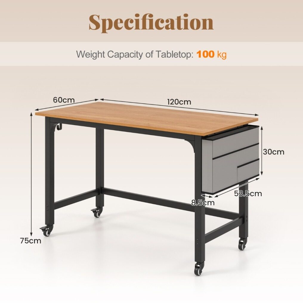 Our desk consists of a sturdy metal frame and engineered boards with a thickness of 1.27cm, which ensures a long service life. The large tabletop offers enough space for office supplies or work equipment. The load capacity is 136kg. With 4 rolling casters, you can move the table flexibly and use it in different places. The brakes on the wheels help to prevent slipping during use. Assembly and maintenance are also easy, and the computer desk will serve you for a long time.