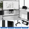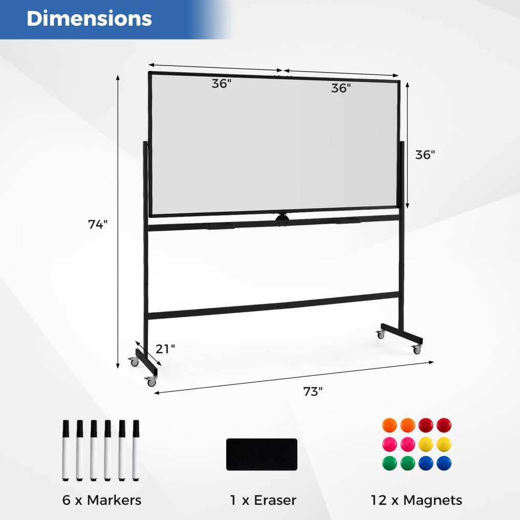 Crafted with a sturdy metal structure, robust aluminum alloy whiteboard frame and rounded ABS edges, this magnetic board glides effortlessly on 4 universal PU casters with brakes, ensuring stability and ease of transit across any workspace. The double-sided, magnetic whiteboard ensures a smooth and long-lasting surface that is resistant to scratches and stains thanks to a specialized baking technique enhancing stain resistance 2x compared to standard boards. Rotating a full 360° with a swing stopper for secure positioning, this mobile whiteboard allows seamless transition between different tasks or presentations. To get you started immediately, this portable white board comes with essential accessories: a magnetic eraser, 6 markers and 12 handy magnets, setting the stage for an unmatched collaborative experience.