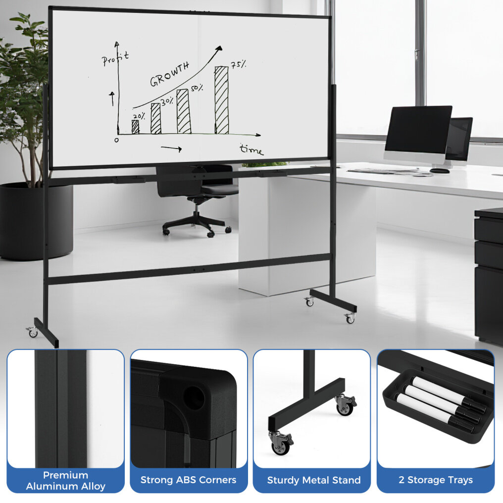 Robust Construction: This mobile standing whiteboard incorporates a sturdy metal construction with an aluminum alloy whiteboard frame, safeguarded with smooth-rounded ABS edges for added safety. This combination not only ensures resilience but also gives a sleek, professional look to your workspace.