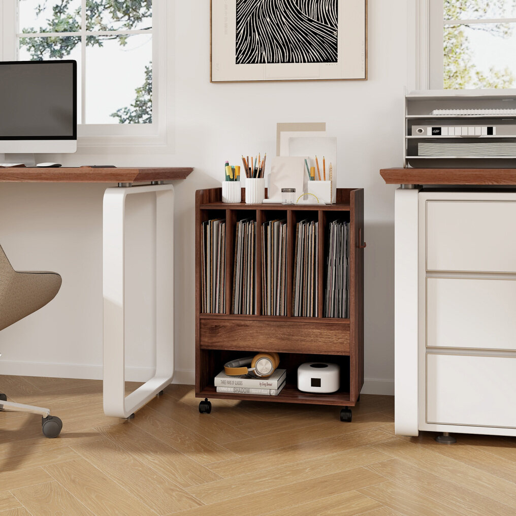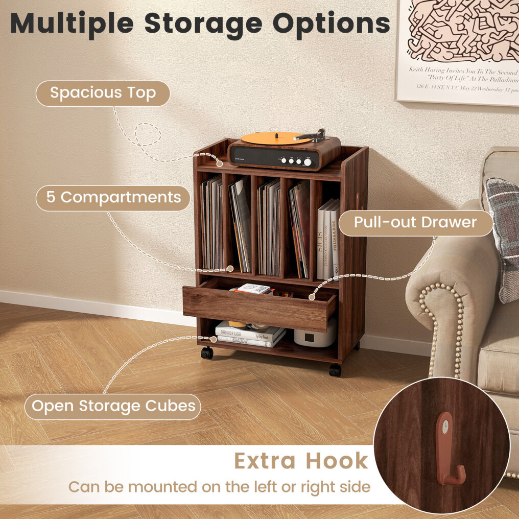 ● User-friendly Design: The vinyl record cabinet's side hook can be installed on either side for flexibility. And its tabletop includes guardrails to prevent items from falling off. What's more, the round corner design can protect you from bumps or scratches.