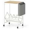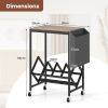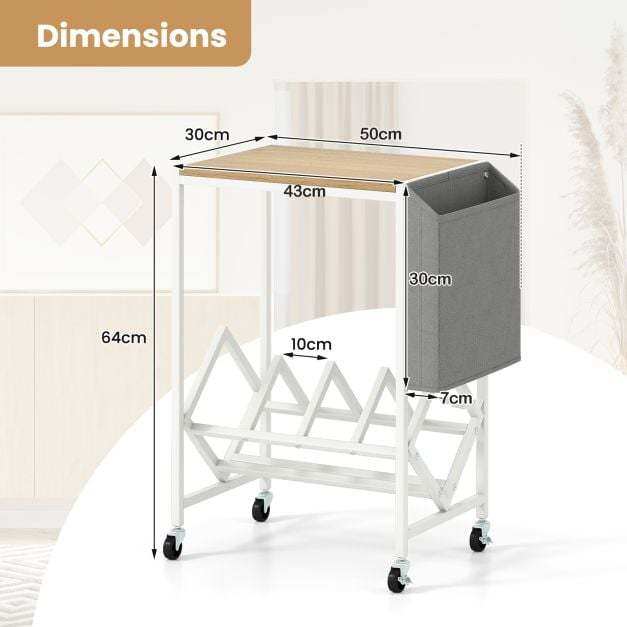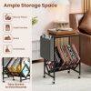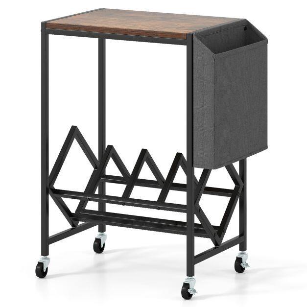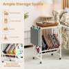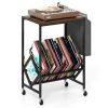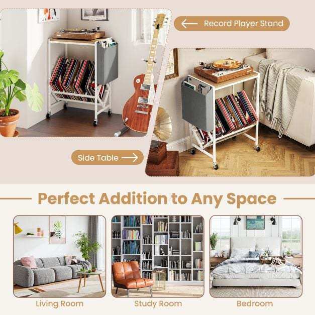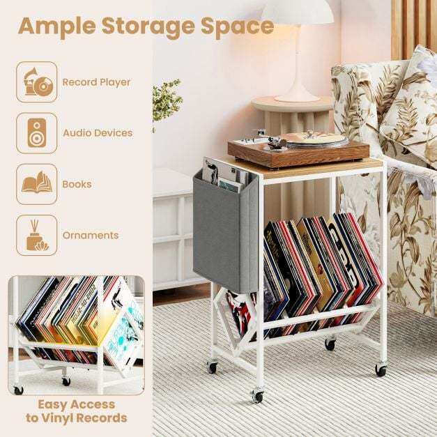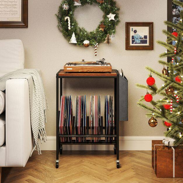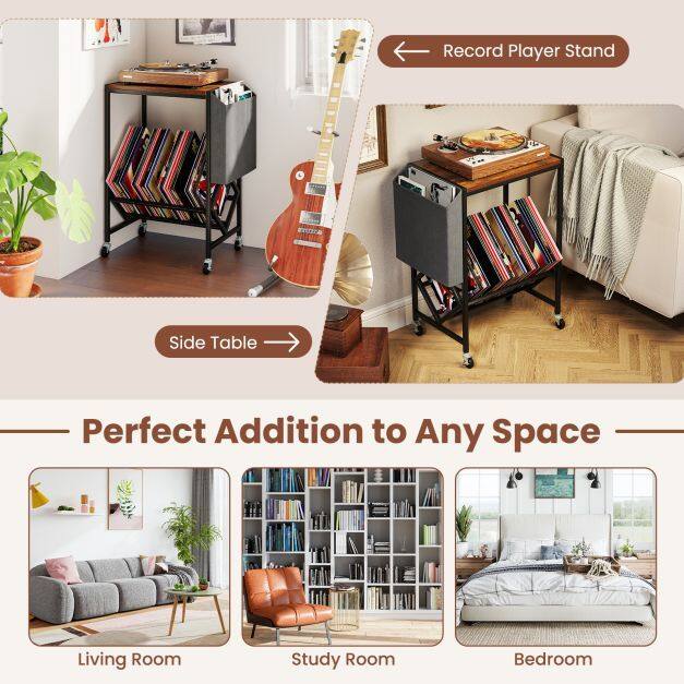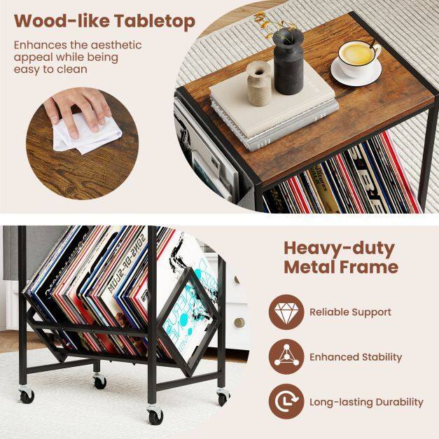 This turntable stand displays your collection at an ideal angle for effortless access. Its wide tabletop comfortably holds your turntable, while the magazine holder adds extra storage for books and small items. Equipped with 4 universal wheels (2 with brakes), the record play stand balances mobility and stability. Built with heavy-duty metal frame, the vinyl display shelf offers durability and support. Combining form with functionality, this versatile record storage table is perfect for vinyl lovers seeking both organization and style.