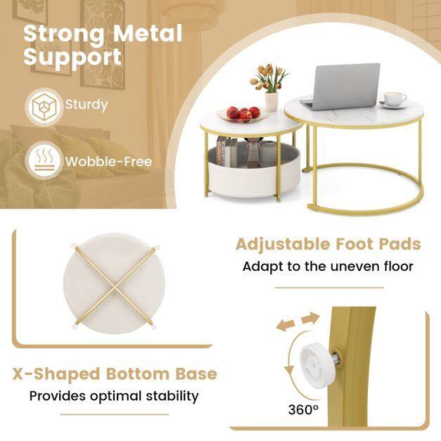 Robust Metal Support: The cocktail table set is notable for its solid metal structures, which support up to 88 kg. The small coffee table, in particular, boasts an X-shaped base that enhances stability. Both tables come with adaptable adjustable foot pads.