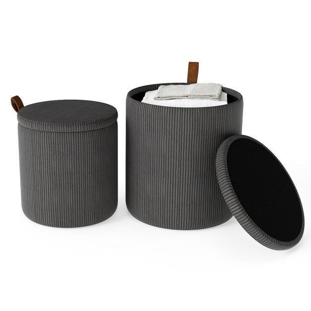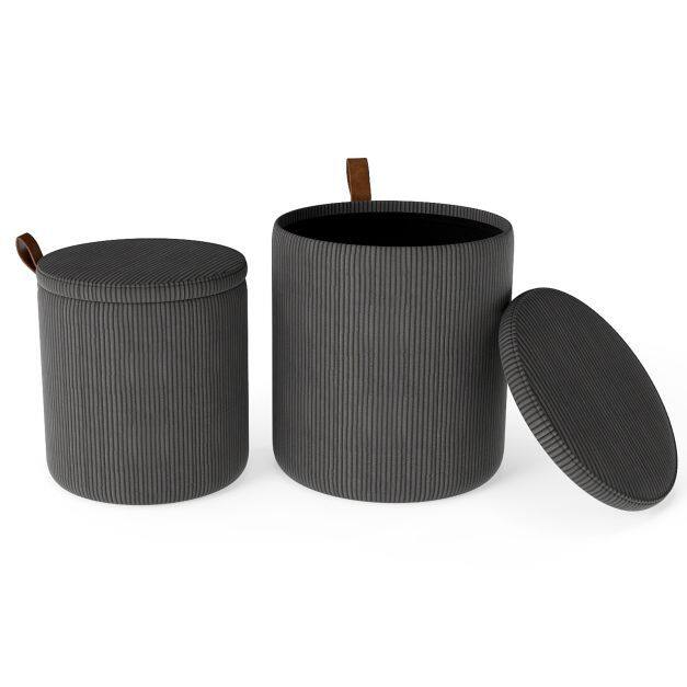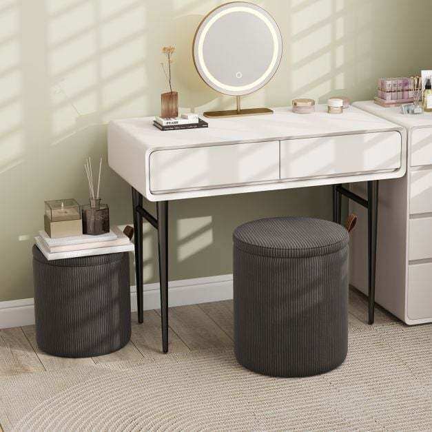 Upholstered in soft corduroy, these vanity stools effortlessly combine sophistication with functionality, offering comfortable seating thanks to high-density sponge. The inner compartments are easily accessible through removable lids featuring artificial leather pulls, making organization a breeze. Ideal for entryways, bedrooms, or living rooms, these corduroy ottoman foot rests serve multiple roles—as seats, footrests, coffee tables, and storage solutions. When not in use, the small ottoman nests within the large one, optimizing space and maintaining a tidy environment.