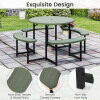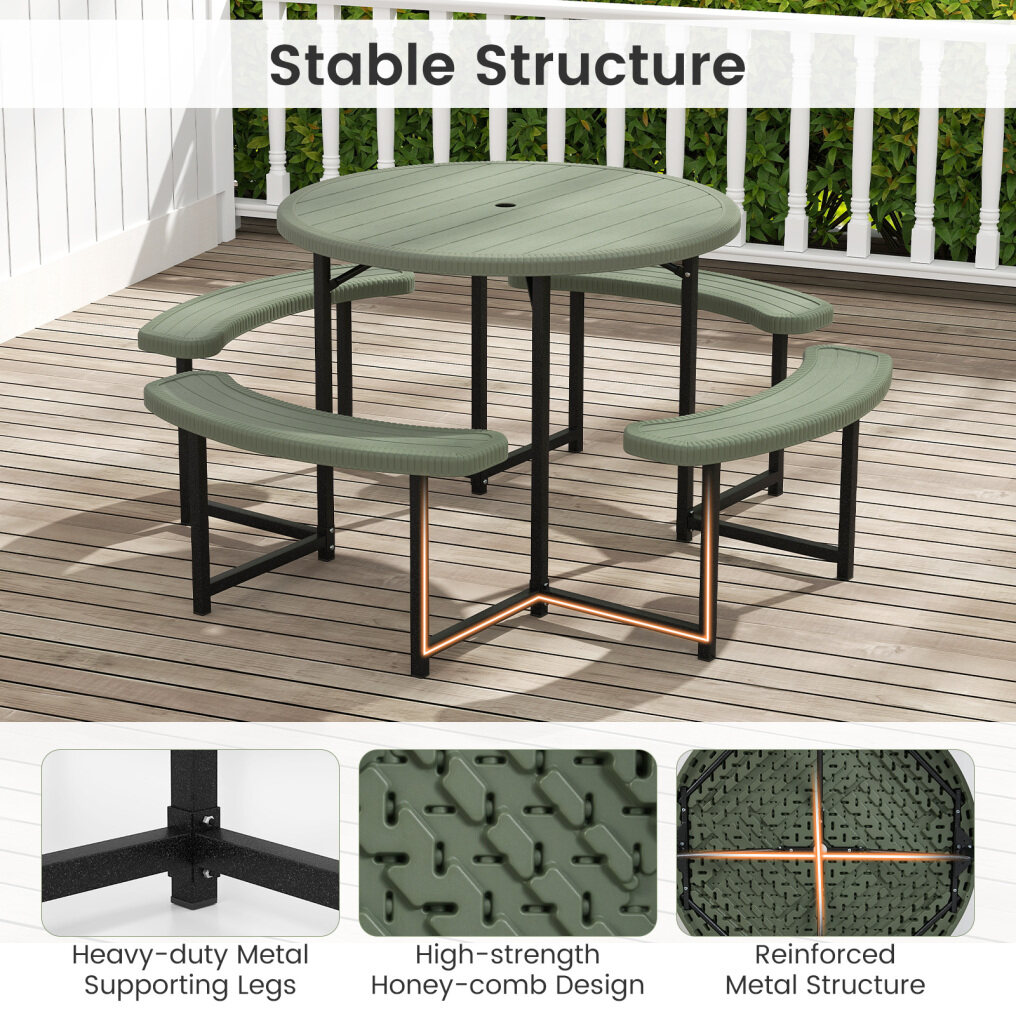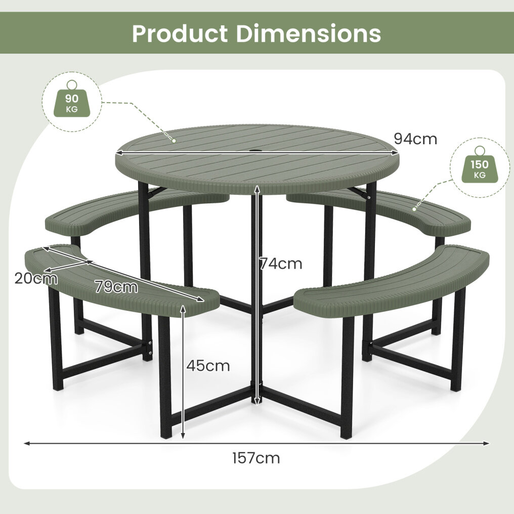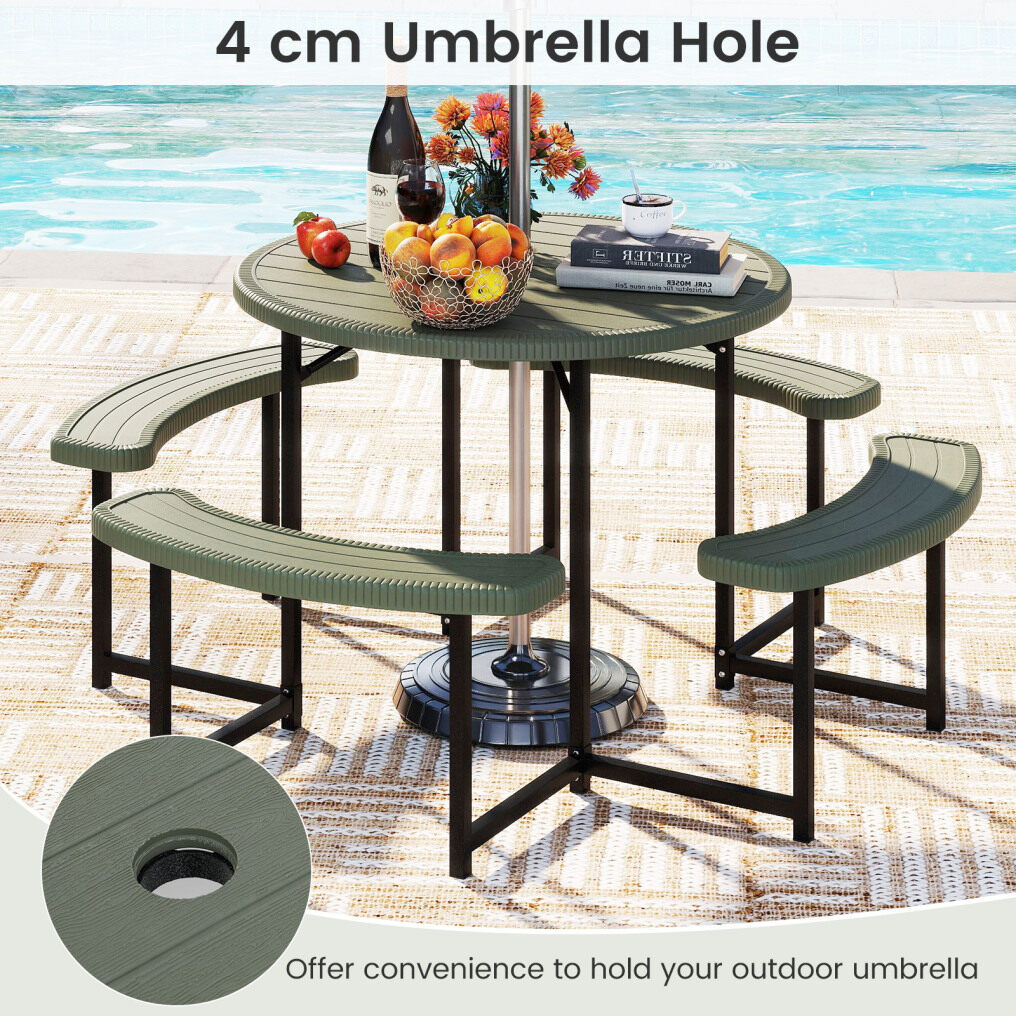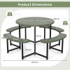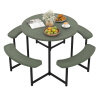 ● 4-8 People Outdoor Dining Set: The 37" round picnic table comes with 4 curved seats for 4-8 people. Furthermore, one seat can be removed to facilitate wheelchair accessibility. Whether hosting a barbecue or enjoying a cozy outdoor meal, the picnic table is the perfect centerpiece for your gatherings.