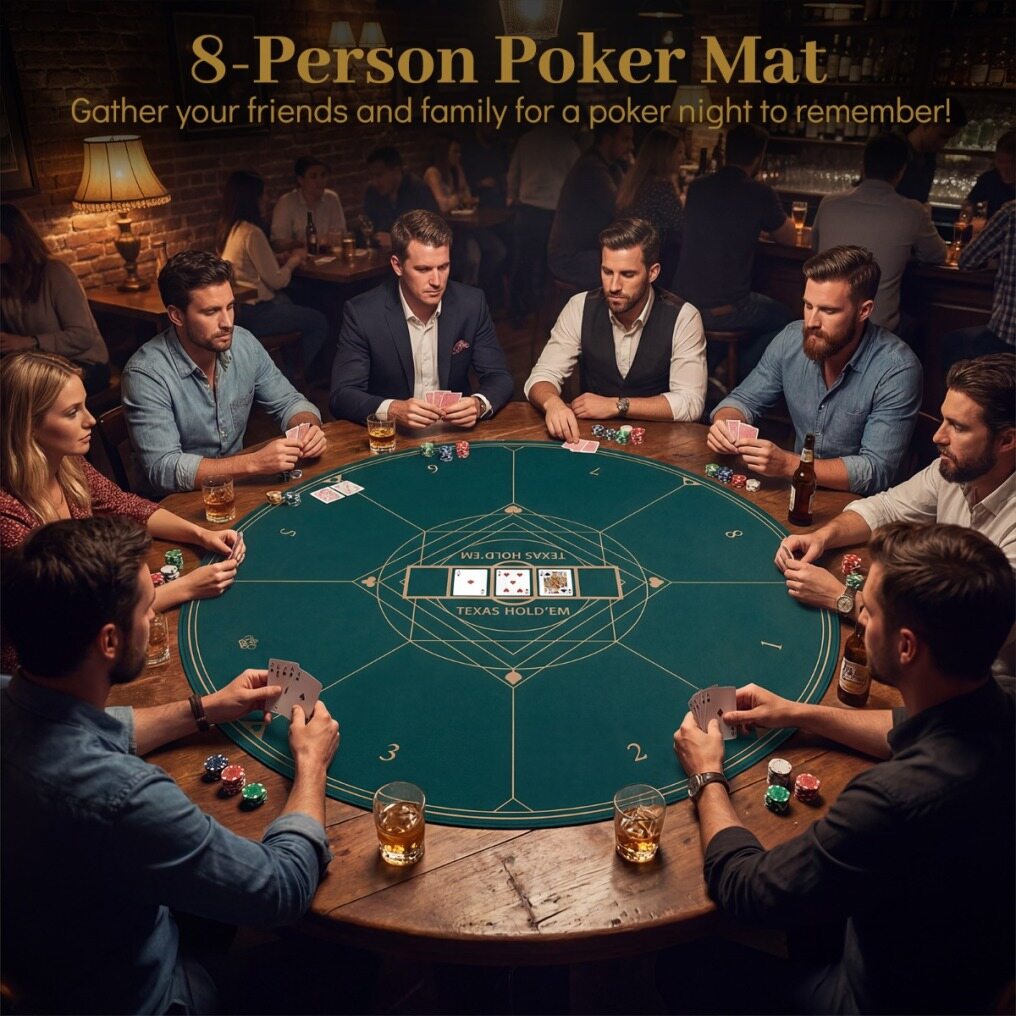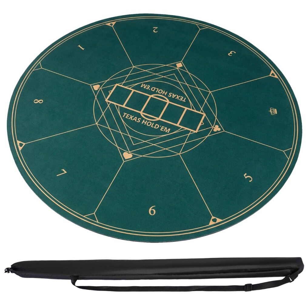 Our 8-person poker mat features an anti-slip rubber base for maximum stability on any surface, whether you’re at a lively party or an outdoor gathering. The high-density poly-cotton fabric resists spills, abrasion, and wear, effortlessly handling years of intense deals and spirited showdowns. Its ultra-lightweight build, paired with a waterproof carrying bag, ensures you can take your blackjack mat anywhere, transforming any space into an instant poker arena. The 47” wrinkle-free playing area accommodates up to 8 players with ease, while the luxurious glide allows cards to sweep smoothly for a first-class Texan Hold’em, Omaha, or blackjack experience.