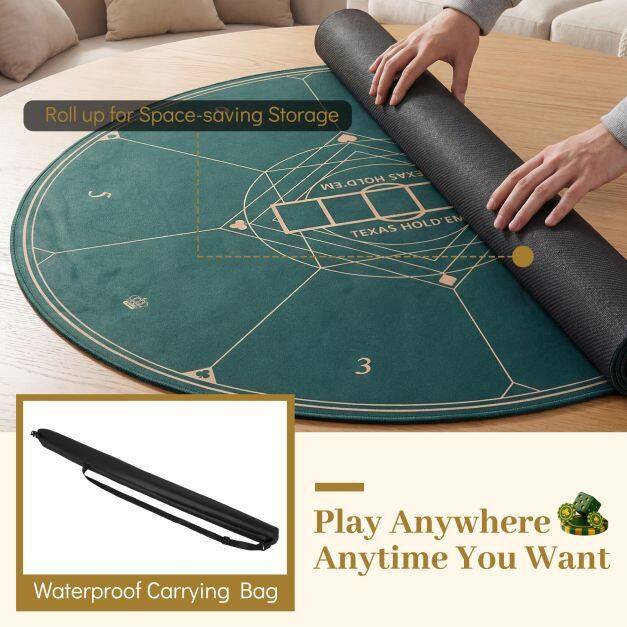 Stay-Power Grip: A non-slip rubber base offers unwavering security, ensuring the poker mat holds firm on any surface. No more frustrating slips, whether you’re in a lively casino or at a backyard barbecue.