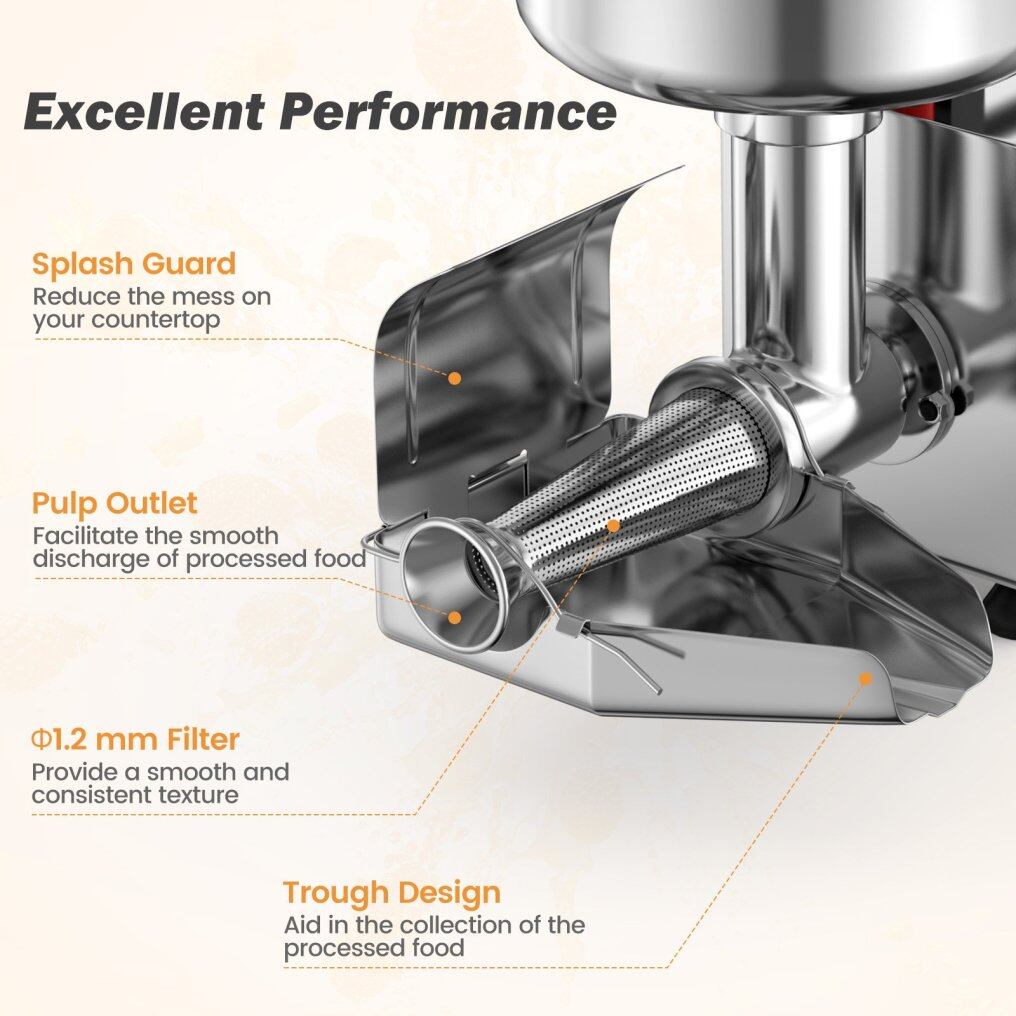 ● High Output Meets Safe Design Standards: Equipped with a powerful 450W copper motor and wide 8.5-inch chute delivering 200-350 lbs per hour, this strainer still maintains safety through its construction. Even under heavy load, the enclosed motor, secure base, and robust switch protect both user and appliance, allowing efficient large-batch work without compromise.